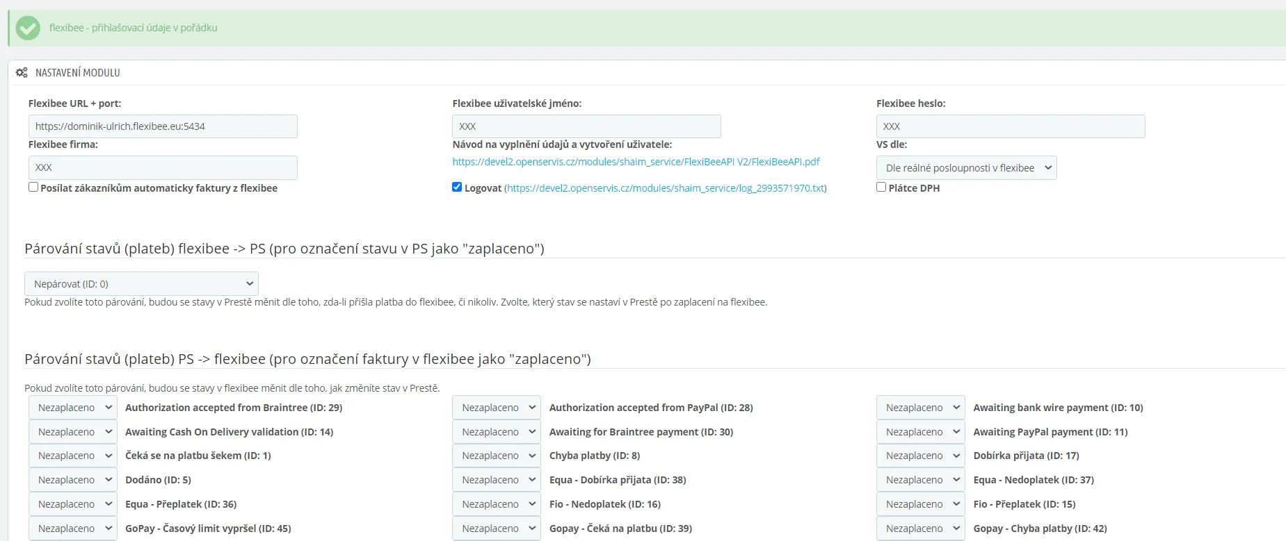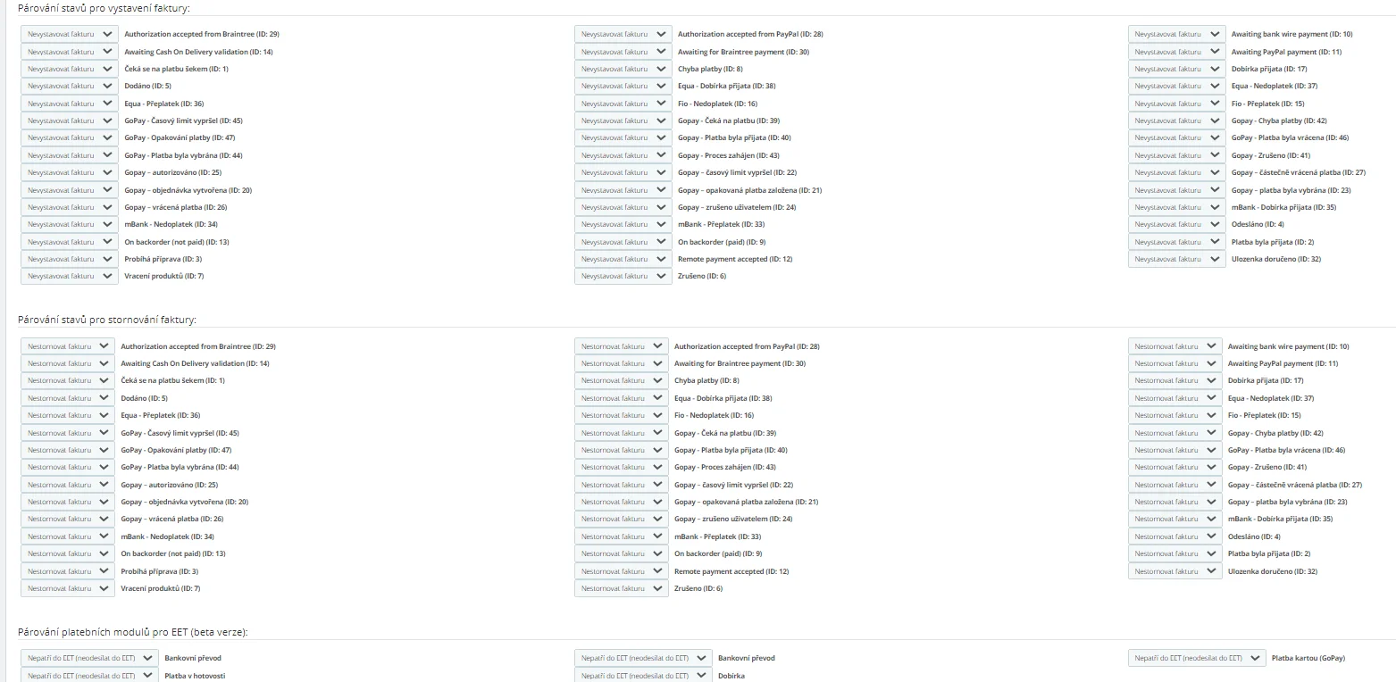 Pokud Vám nevyhovují faktury v PrestaShopu, můžete napojit Vaše účetnictví přes API na službu "ABRA FlexiBee". Možnost nastavení stavů, kdy se má faktura vystavit a označit jako zaplacená.