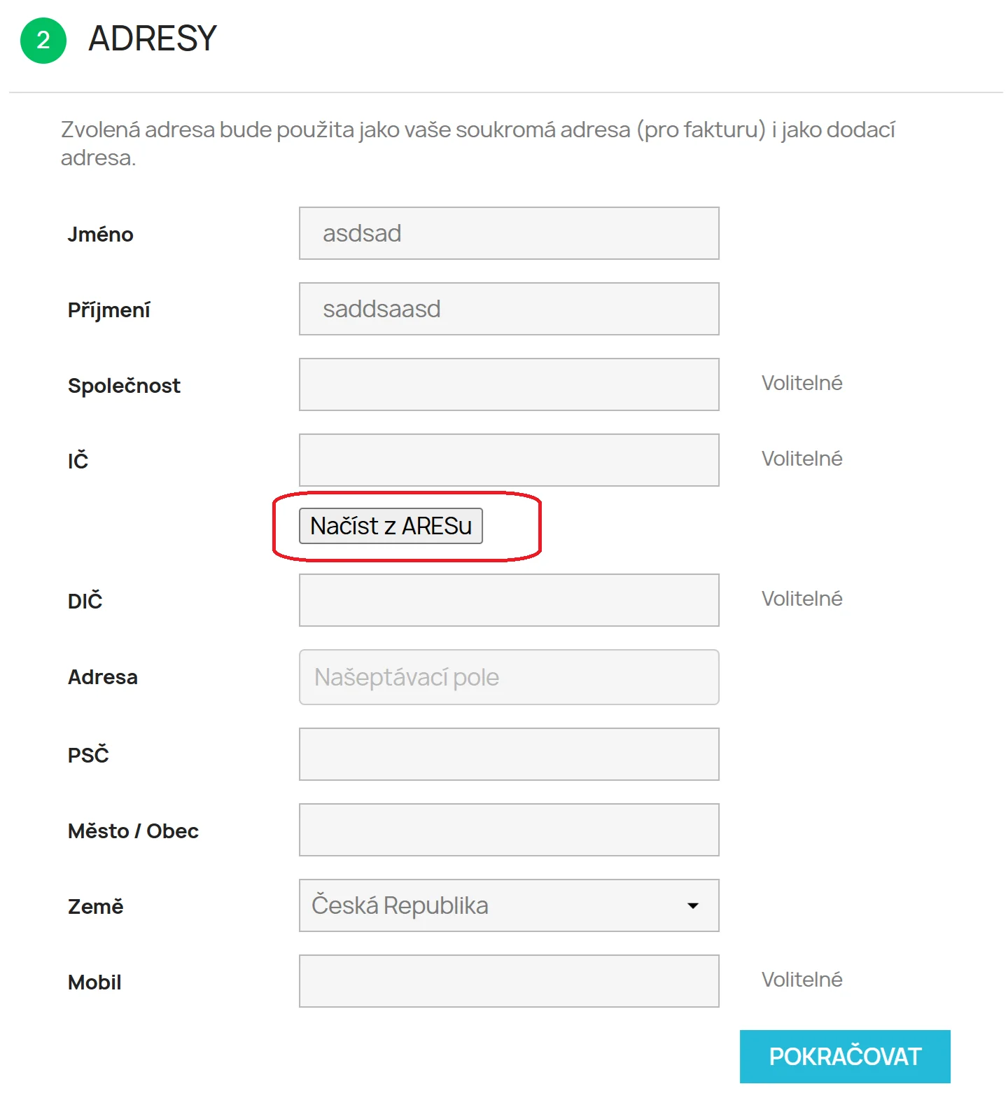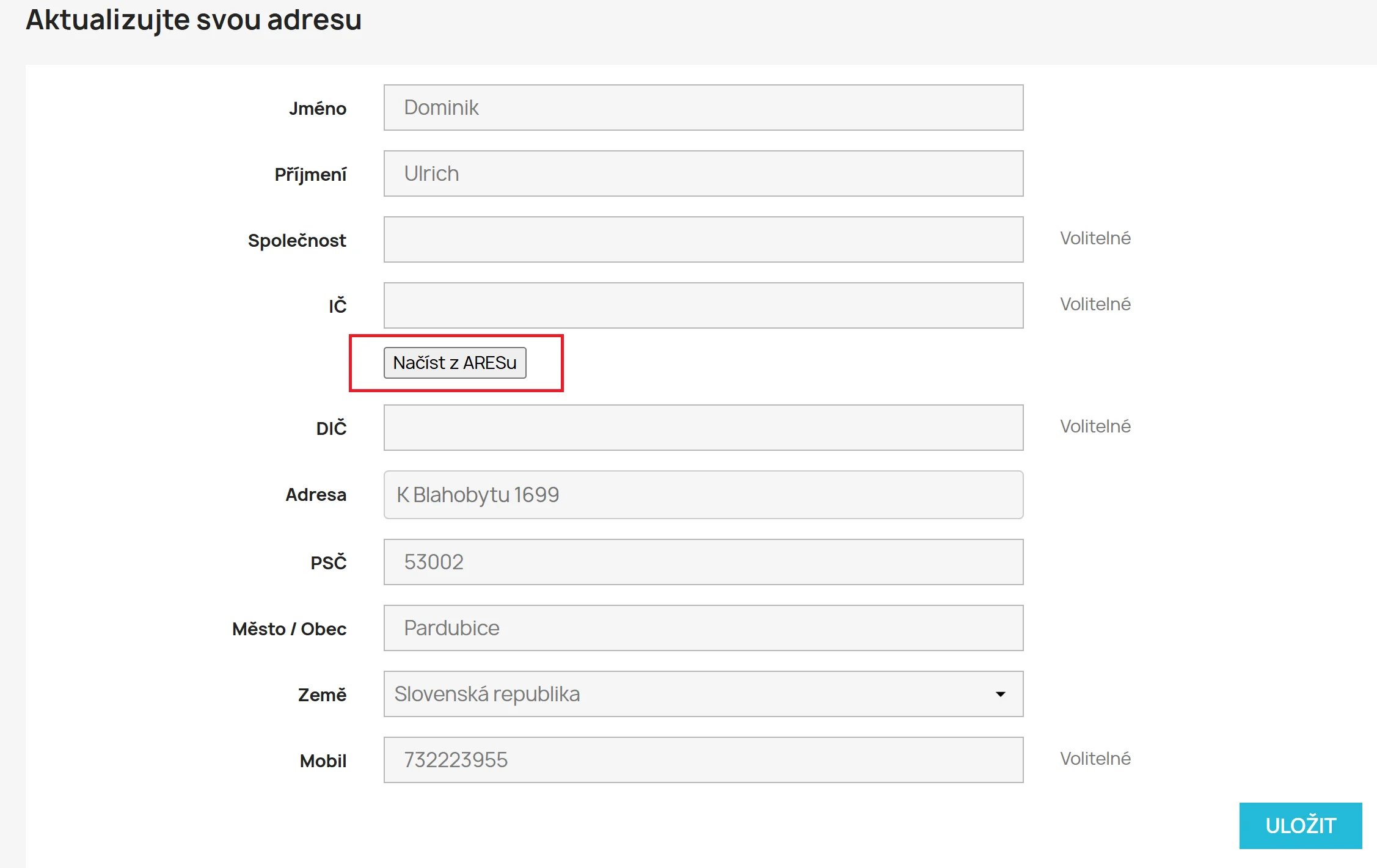Modul ARES přidává tlačítko "Načíst z ARESu" hned pod pole pro IČO. Po zadání IČO a kliknutí na toto tlačítko se automaticky stáhnou kontaktní údaje přímo z ARESu. Tímto způsobem šetříte čas svým zákazníkům, kteří nemusí trávit čas ručním vypisováním potřebných informací.