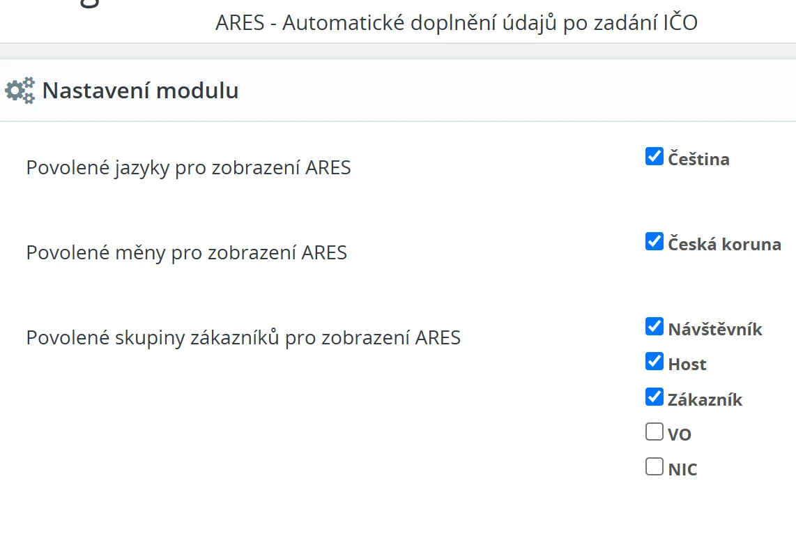 Modul ARES je ideálním řešením pro e-shopy zaměřené na firemní zákazníky. Zjednodušte a urychlete proces nákupu a nabídněte svým zákazníkům komfort, který si zaslouží.