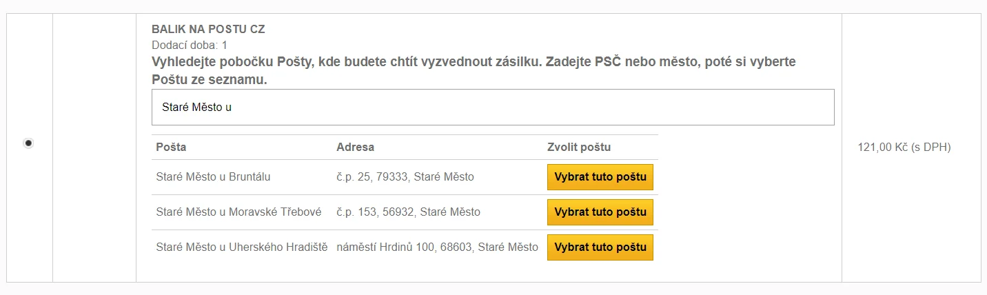 Modul pro dopravu Balík Na poštu (CZ) výrazně usnadňuje proces doručení pro vaše zákazníky. Díky tomuto modulu si mohou zákazníci snadno vybrat konkrétní pobočku České pošty, na které si chtějí balík vyzvednout. Tato volba je přehledně zobrazena přímo v administraci vašeho e-shopu.