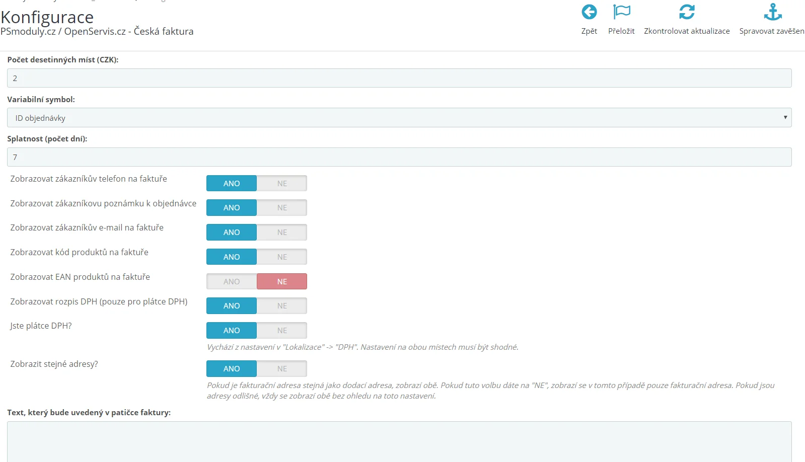 • upraveno vystavení faktur do jiné země, kdy je zvolen jiný jazyk, aby byl správně formát všech datumů. Dříve byl formát napevno "j. n. Y", nyní používáme formát dle nastavení příslušného jazyka v PrestaShopu