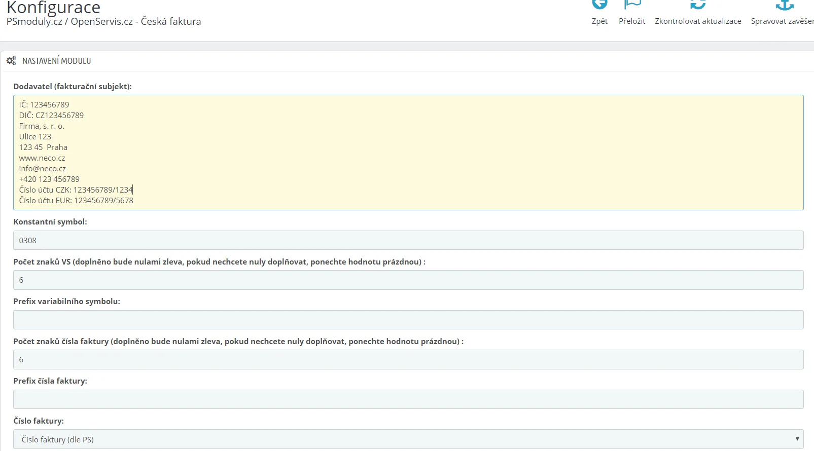 • opravena chyba, kdy se v e-shopu BEZ multistore ve verzi PS 1.6.x.x nemusely správně propsat vyplněné údaje z nastavení do faktury. (u 1.7 a vyšší problém není)