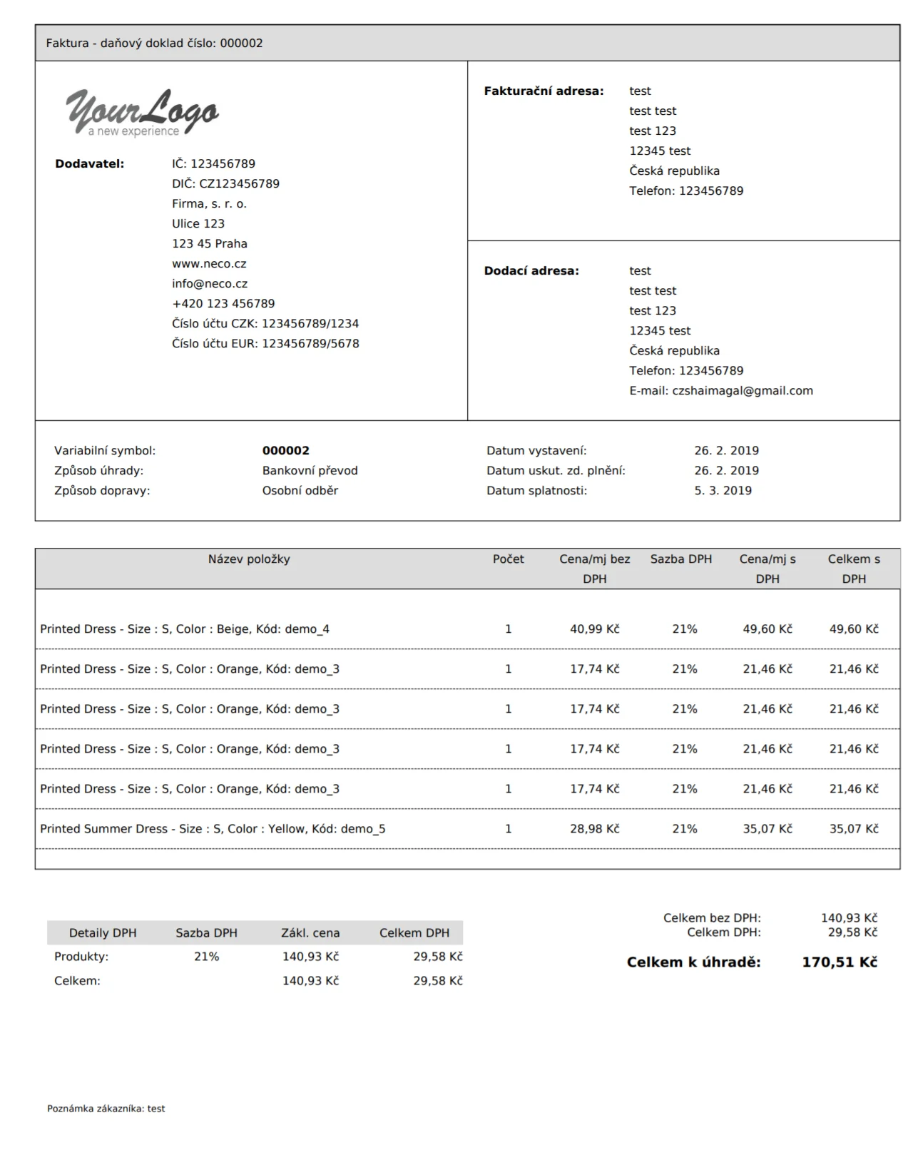 V základu není faktura dle platných českých / slovenských zákonů, využijte tuto grafickou nadstavbu, ať máte vše správně. Vyčíslení DPH, sedící částky, 2 desetinná místa, zaokrouhlení. Používejte faktury v PrestaShopu na plno.