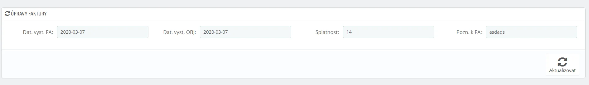 • Nahrání razítka a možnost změny dat vystavení objednávky a faktury.