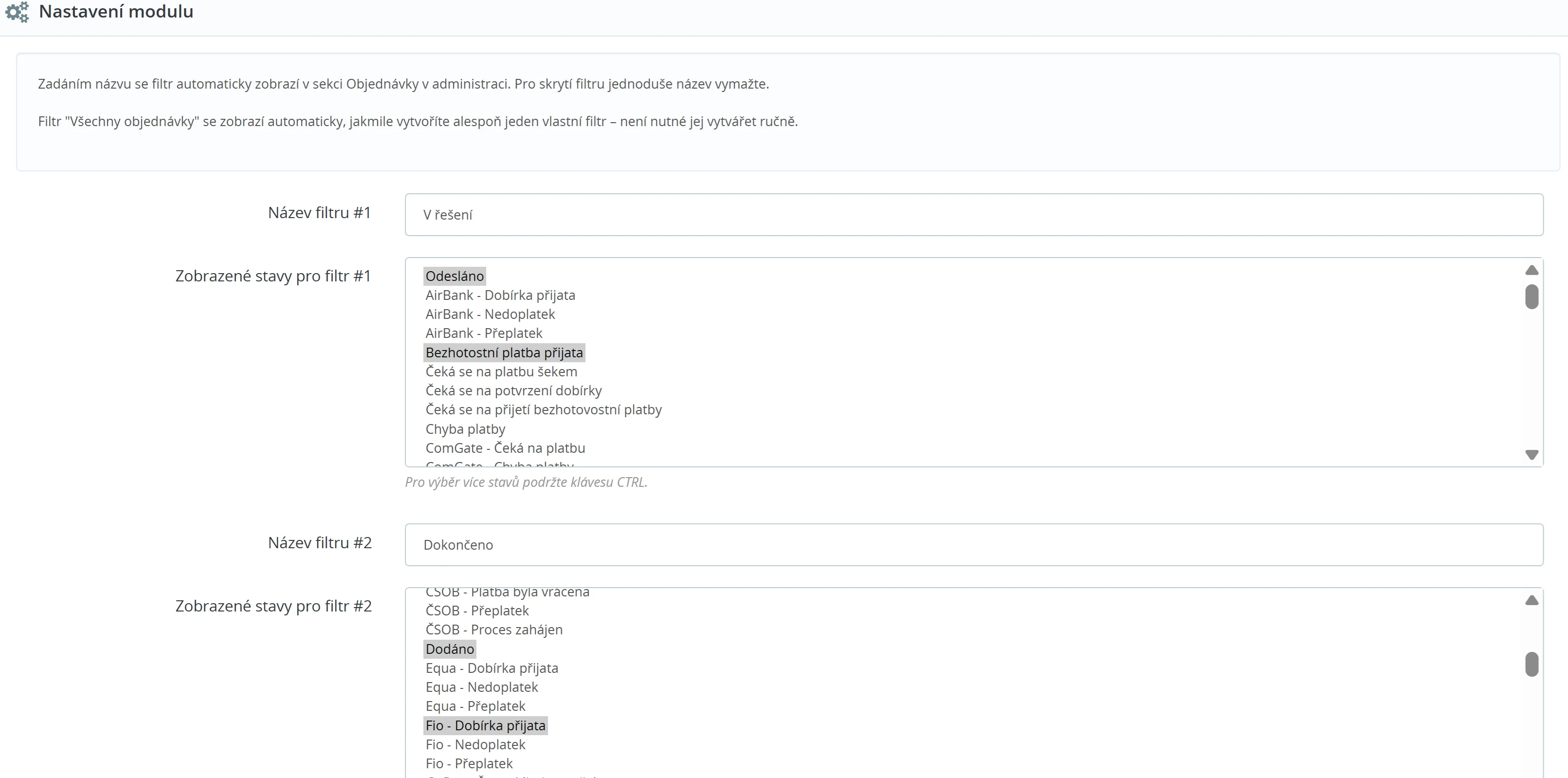 V základním nastavení lze v sekci Objednávky filtrovat pouze podle jednoho stavu objednávky. Tento modul však umožňuje vybrat více stavů najednou, takže si můžete snadno zobrazit pouze ty objednávky, které vás zajímají – například všechny, které čekají na vyřízení.