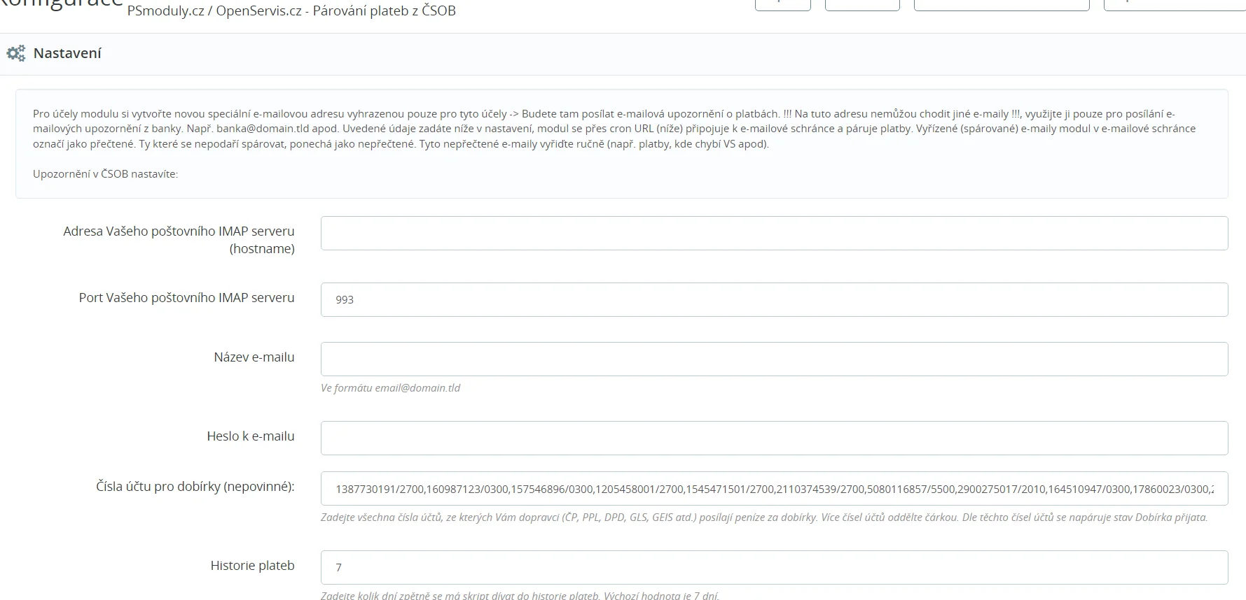Modul pro automatické párování plateb mezi vaším e-shopem a bankou ČSOB je skvělým řešením pro zjednodušení procesu správy plateb. Už nikdy nebudete muset ručně kontrolovat, zda platba dorazila. Tento modul vám umožní monitorovat přijaté platby několikrát za hodinu pomocí parsování e-mailové adresy, na kterou budou zasílána potvrzení o platbě.