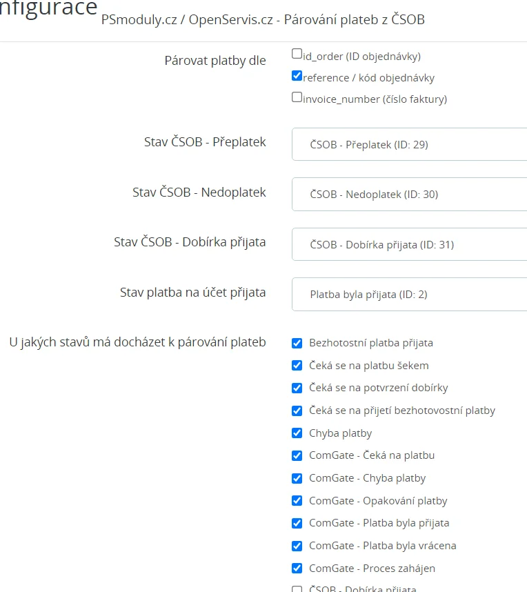 Modul umí rozeznat dobírky od ČP, PPL, Geis, GLS a DPD. Pokud máte jiného dopravce, jednoduše přidejte číslo účtu, ze kterého vám chodí dobírky, do nastavení modulu. Pokud nechcete měnit stav u plateb za dobírky, můžete nastavit variantu "neměnit".