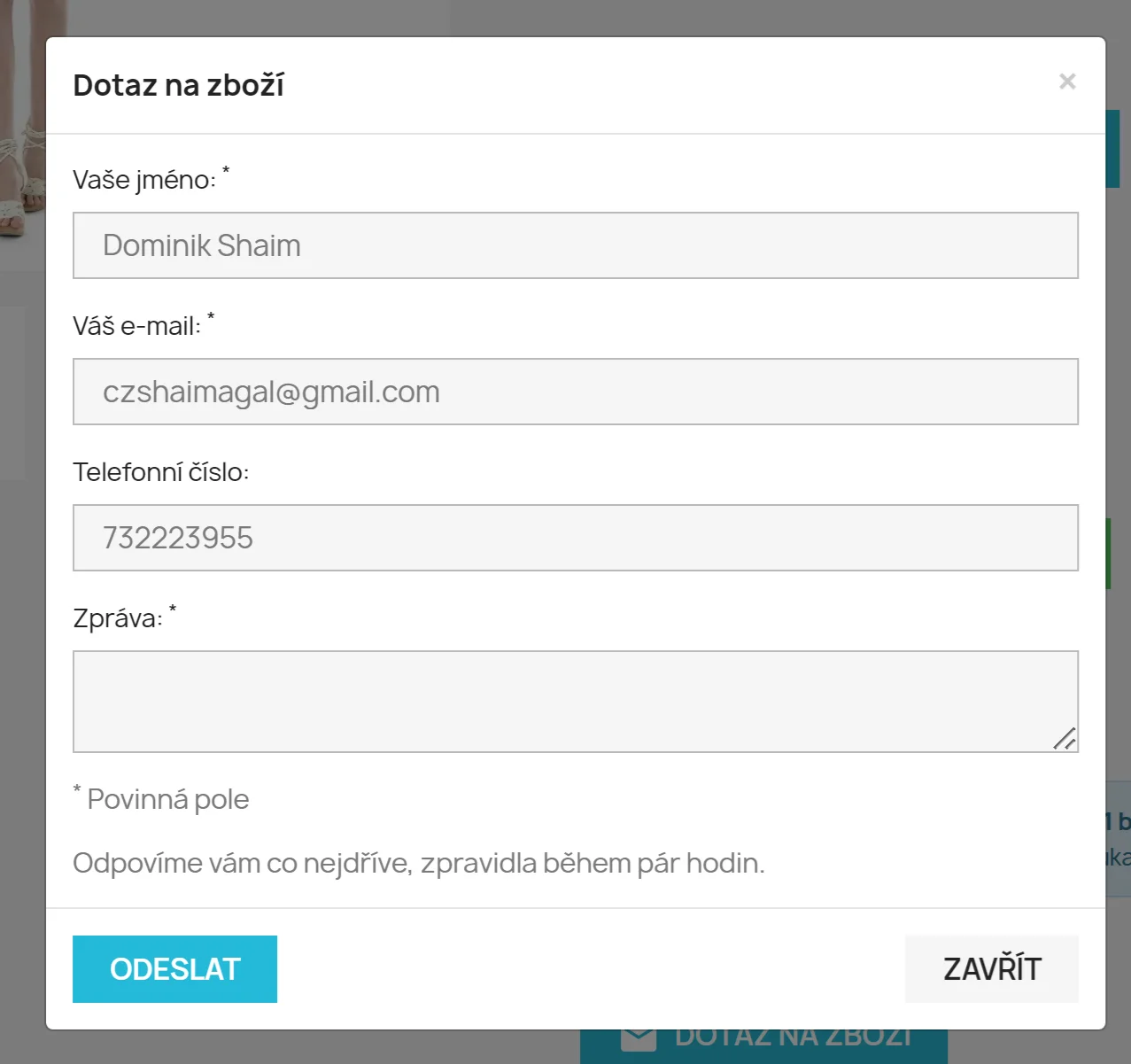 Vaši zákazníci mohou jednoduše vyplnit formulář pro zaslání dotazu o produktu. V případě, že jsou přihlášeni, budou jejich jméno, e-mail a telefonní číslo automaticky předvyplněny, což zjednoduší celý proces.
