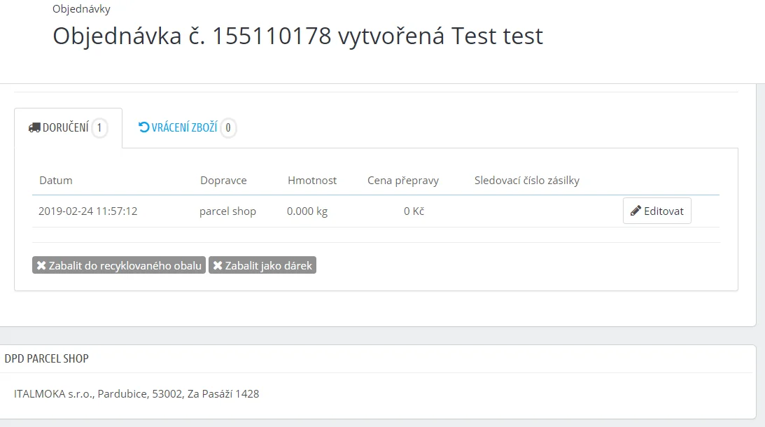 Zvolená pobočka se po dokončení objednávky zobrazuje přímo v administraci v detailu objednávky. Tento způsob zobrazení je záměrný, jelikož zajišťuje spolehlivost a kompatibilitu s většinou objednávkových modulů. Navíc je možné modul kombinovat s modulem na online podání, který přenáší vybrané místo do online podání.