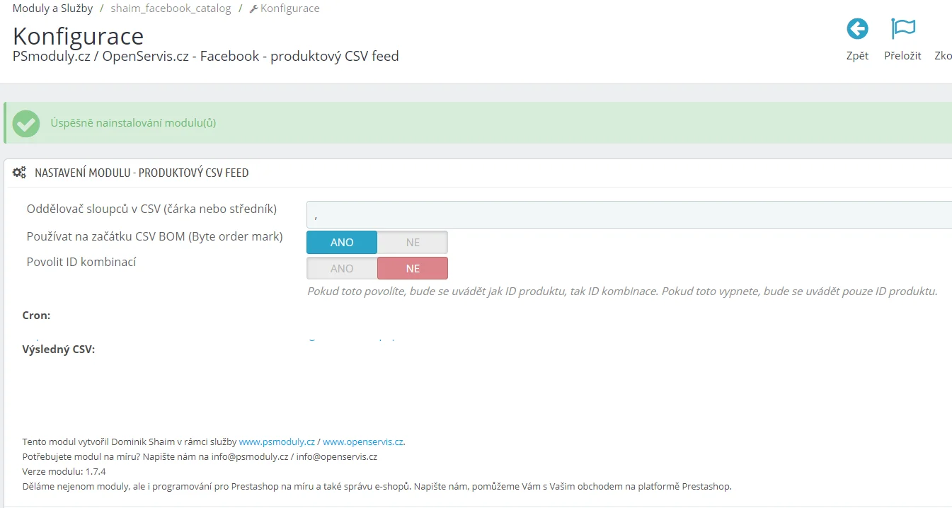 Pro komplexnější řešení doporučujeme zakoupit modul "Komplexní XML export pro srovnávače", který rovněž zahrnuje Facebook feed, ale ve formátu XML a s mnohem více údaji.
