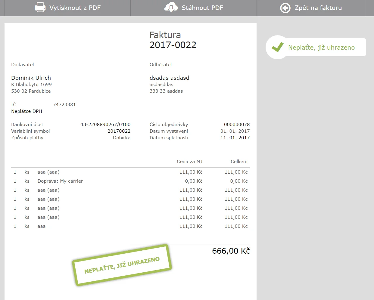 | Vytváří si neaktivní admin účet? | ano (kvůli "podepisování" stavů objednávek) |