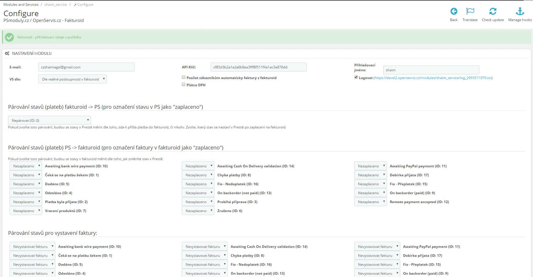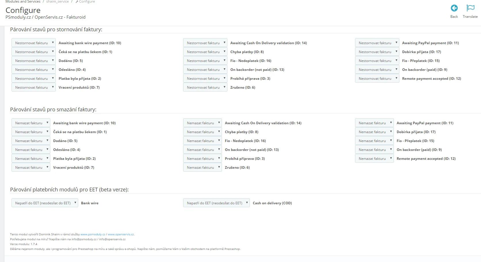 Pokud Vám nevyhovují faktury v PrestaShopu, můžete napojit Vaše účetnictví přes API na službu "Fakturoid". Možnost nastavení stavů, kdy se má faktura vystavit a označit jako zaplacená.