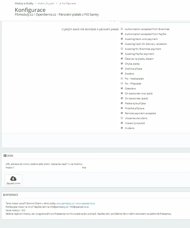 Tyto stavy lze také přizpůsobit (napárovat akci na jiný stav). Modul se řídí oficiální specifikací od FIO banky, kterou najdete zde.