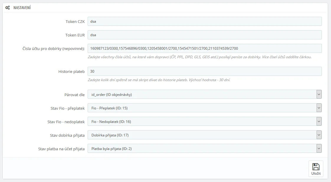 V závislosti na tom, jaké variabilní symboly (VS) poskytujete svým zákazníkům, můžete nastavení upravit. Jakmile modul nalezne platbu s odpovídajícím VS, automaticky označí objednávku jako zaplacenou. Vyhledávání probíhá primárně v poli "Variabilní symbol", a pokud není nalezen, modul prohledává také poznámky (typické pro platby ze zahraničí, kde je VS často uvedeno v poznámce).