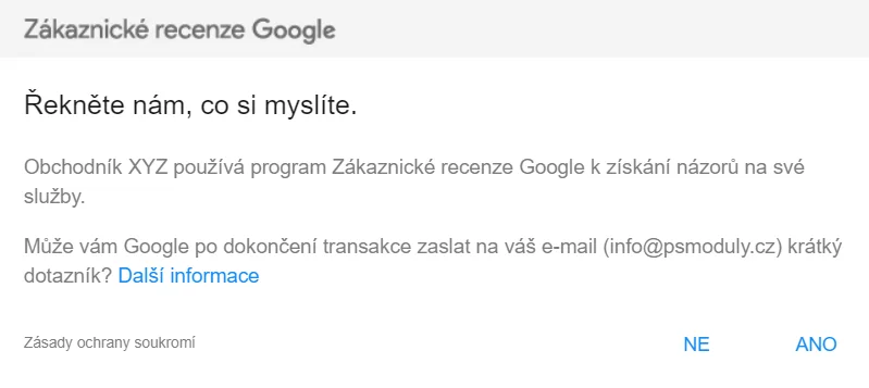 Modul GCR - Zákaznické recenze Google je efektivním nástrojem, který vám umožní získávat cennou zpětnou vazbu od vašich zákazníků. Na poslední stránce objednávky modul požádá zákazníka o hodnocení jeho nákupu, což vám pomůže zlepšit služby a zvýšit důvěru ve váš e-shop.