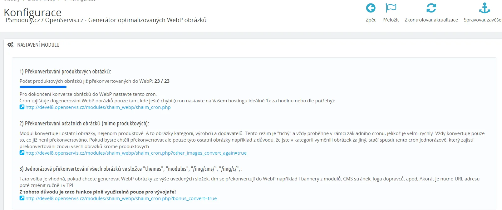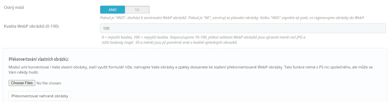 Jednou z dalších užitečných funkcí modulu je možnost "překonvertování vlastních obrázků". Stačí nahrát vaše obrázky prostřednictvím formuláře v modulu a modul vám vrátí ke stažení WebP variantu nahraných obrázků pro vaše další použití.
