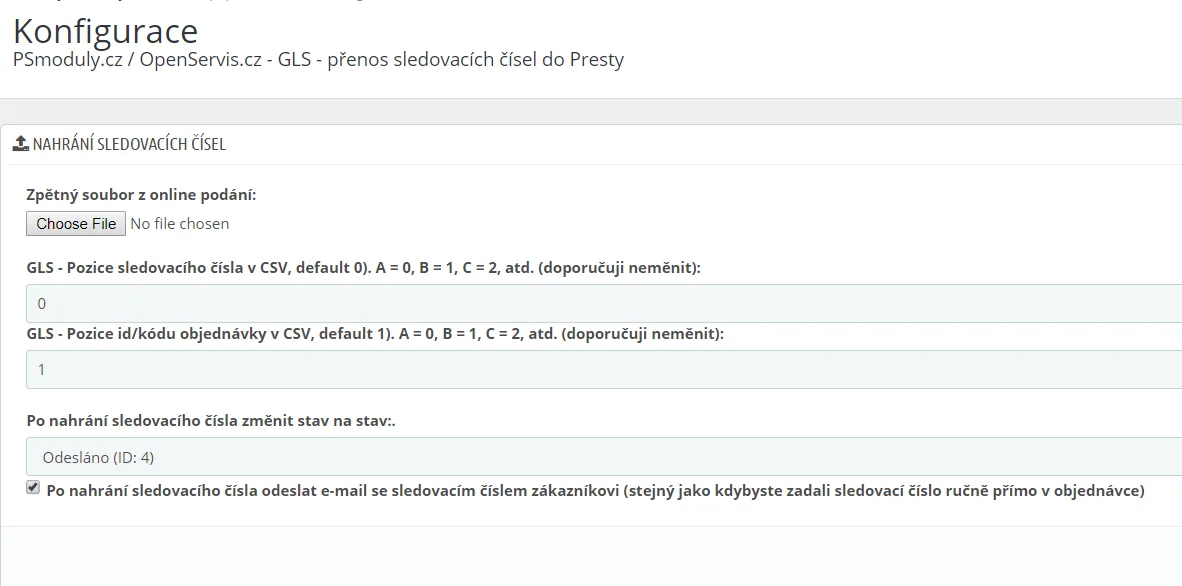 Pomocí jednoduchého uploadu CSV souboru z Online podání GLS můžete hromadně nahrávat sledovací čísla. Modul automaticky spáruje sledovací čísla s odpovídajícími objednávkami a nastaví jim stav odesláno. V případě potřeby si můžete v nastavení modulu zvolit jiný stav, který vám vyhovuje.