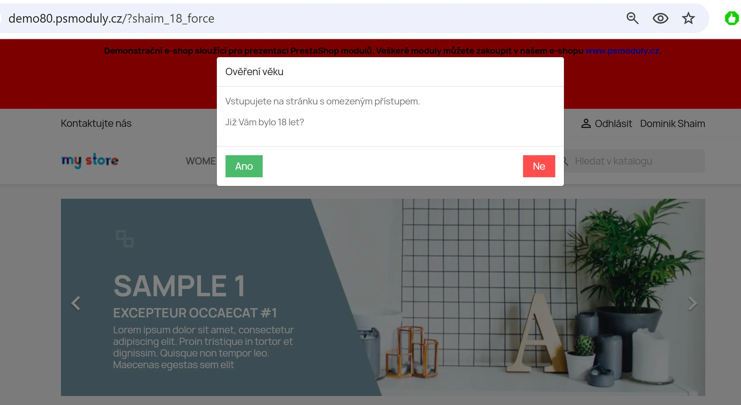 Po aktivaci modulu se návštěvníkovi zobrazí popup okno, které vyžaduje potvrzení o dosažení věku 18 let. Pokud návštěvník hlášku nepotvrdí, nebude moci pokračovat na stránku e-shopu a bude automaticky přesměrován na neutrální web, například google.com. URL adresu pro přesměrování lze nastavit dle potřeb provozovatele e-shopu.