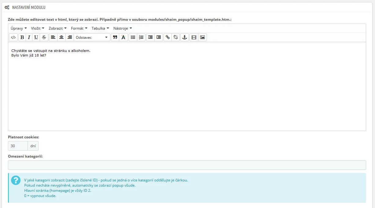Modul pro zobrazení hlášky 18+ v novém okně (PopUp) při vstupu na web je ideálním řešením pro e-shopy prodávající zboží, které podléhá věkovému omezení. Tento modul je typický pro prodej tabákových výrobků, erotického zboží nebo zbraní.