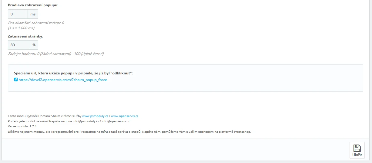 Modul obsahuje speciální URL adresu, kterou lze využít pro vynucení zobrazení popup okna, což usnadňuje jeho testování a ladění.