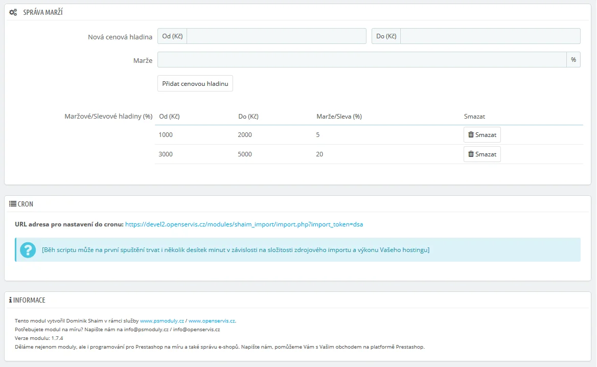 Tento modul není krabicovým řešením, ale vždy se přizpůsobuje konkrétnímu feedu a požadavkům zákazníka. Zakázky jsou dodávány v souladu s nejmodernějšími standardy, což zajišťuje dlouhodobou funkčnost importů. Naši zákazníci využívají naše řešení i více než 5 let bez potřeby další správy, servisu nebo podpory. Samozřejmě, vše závisí i na dodavateli a případných změnách v jeho nabídce.
