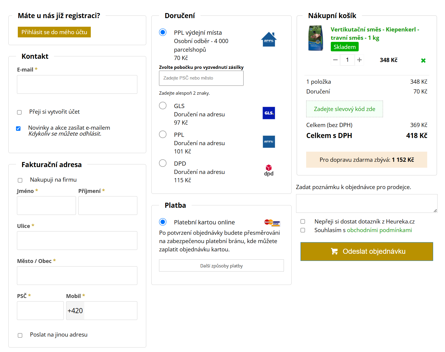 Platební metody jsou zobrazeny okamžitě a formou přepínačů, bez zbytečného čekání na zadání adresy nebo potvrzení obchodních podmínek.