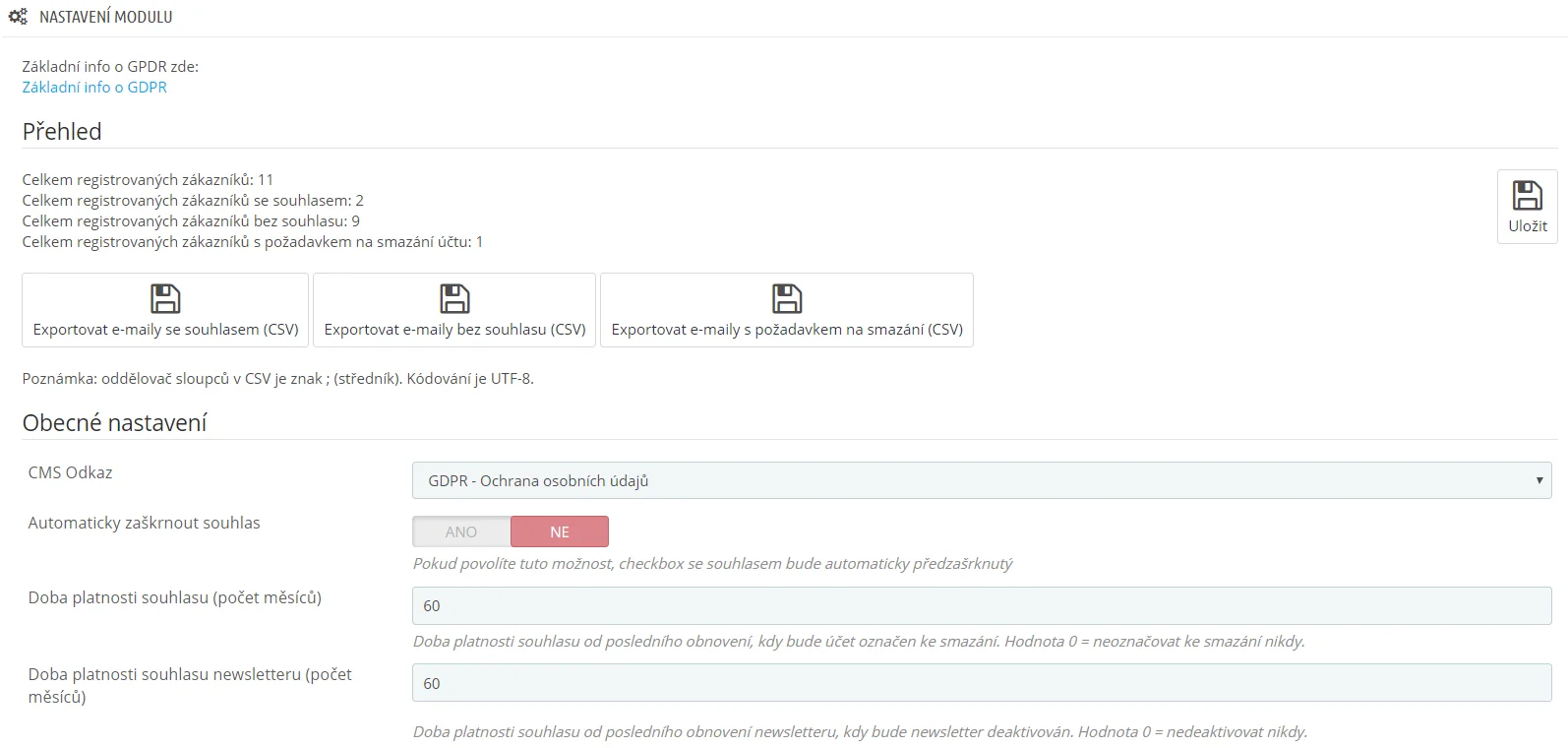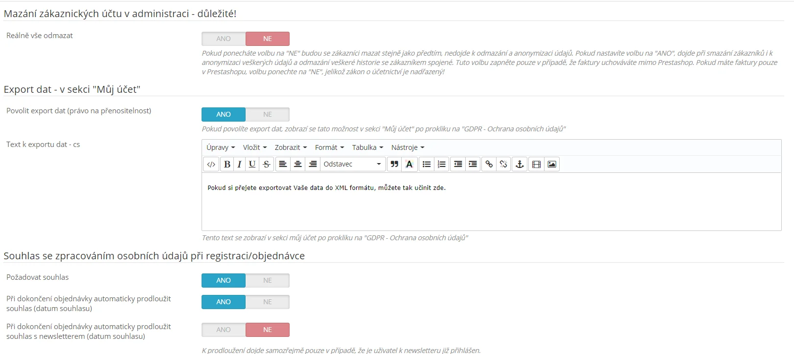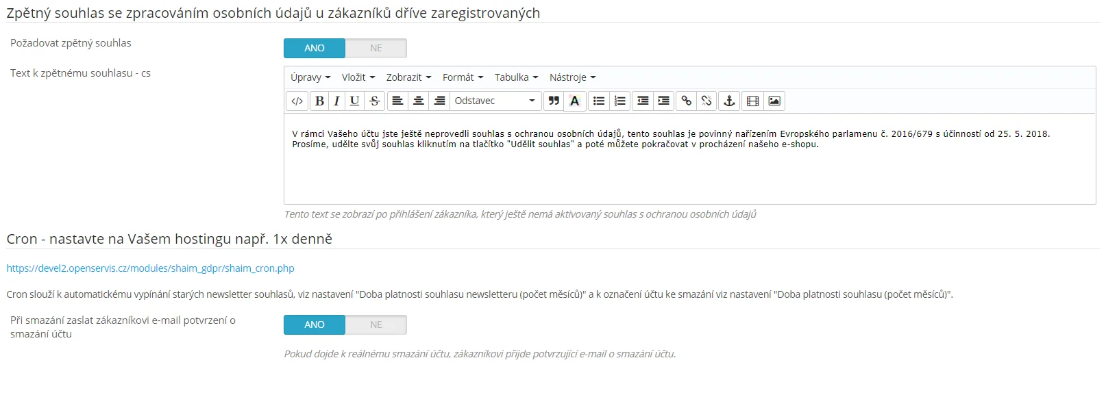 Modul je parádní. V administraci je možné mít vše pod kontrolou. Přidá zaklikávací souhlas při registraci. Je možné si nechat smazat v administraci zákazníka všechno, co je v shopu k vaší osobě (zákazníka).