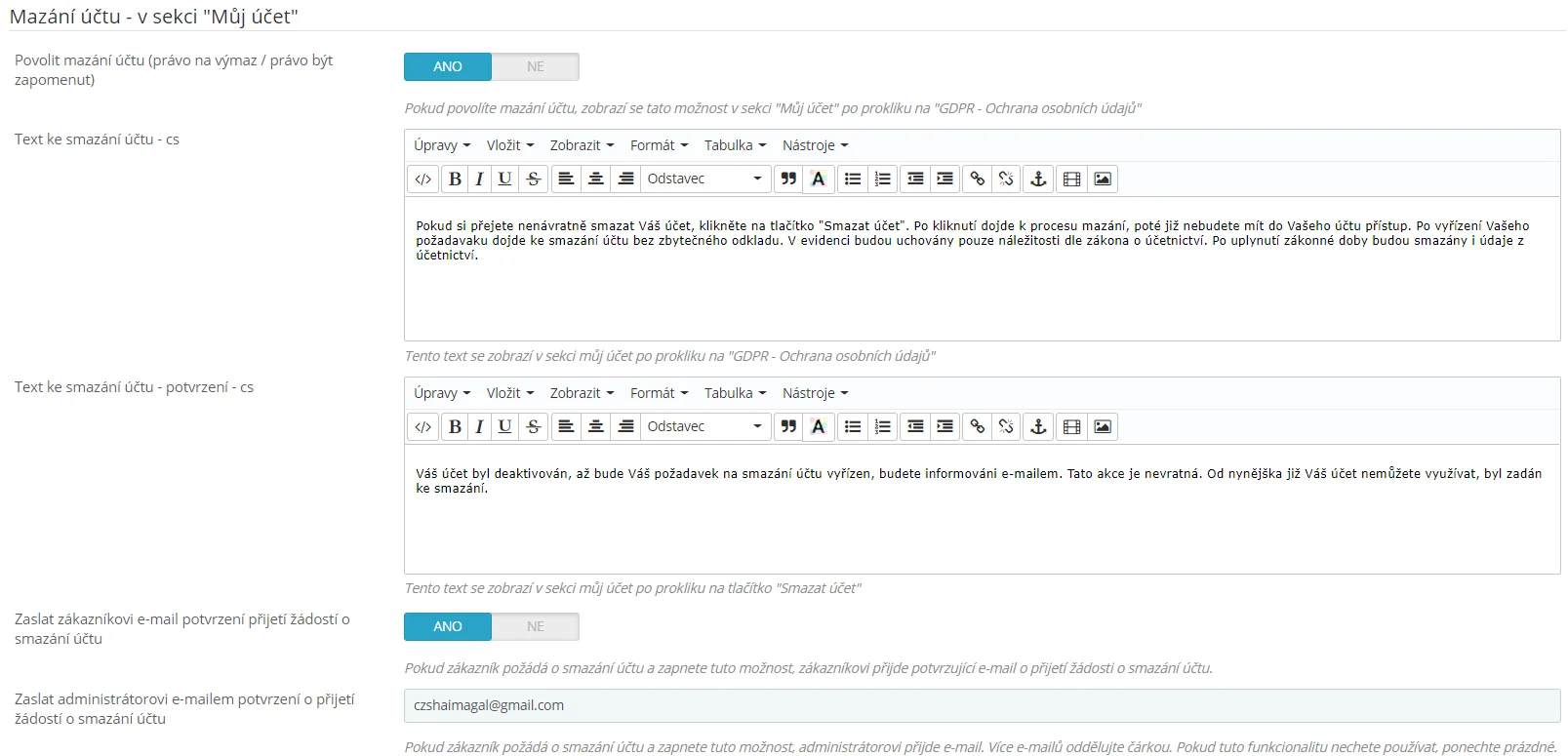 Uživatelé mohou požádat o smazání svého účtu v sekci "Můj účet". O samotném smazání rozhoduje administrátor e-shopu. Je také možné nastavit e-mailové upozornění o této žádosti jak pro majitele e-shopu, tak pro zákazníka.