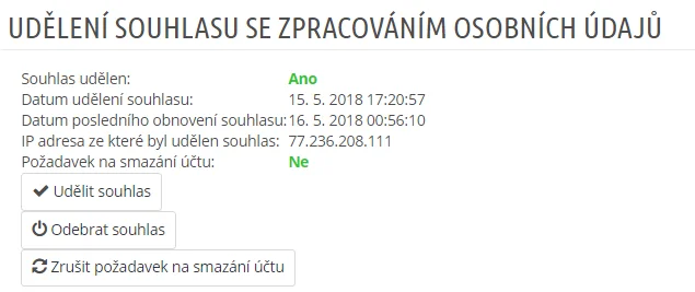 Modul umožňuje administrátorům přidat nebo odebrat souhlas se zpracováním osobních údajů nebo zrušit žádost o smazání účtu přímo v administraci.
