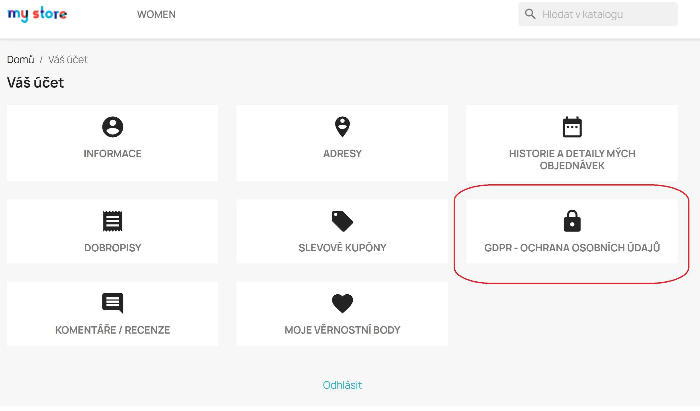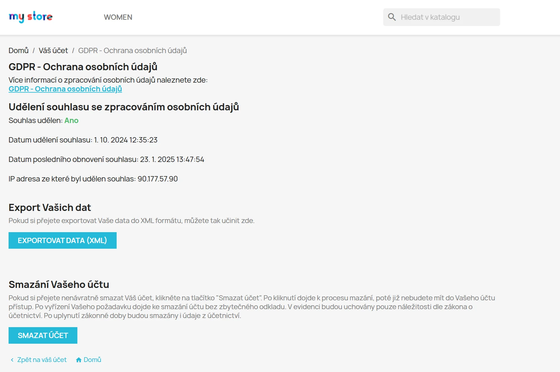 Zákazníci mohou požádat o export svých dat (osobní údaje, adresy, objednávky) v sekci "Můj účet". Tento export probíhá automaticky a zákazník obdrží XML výstup ihned po kliknutí na žádost.
