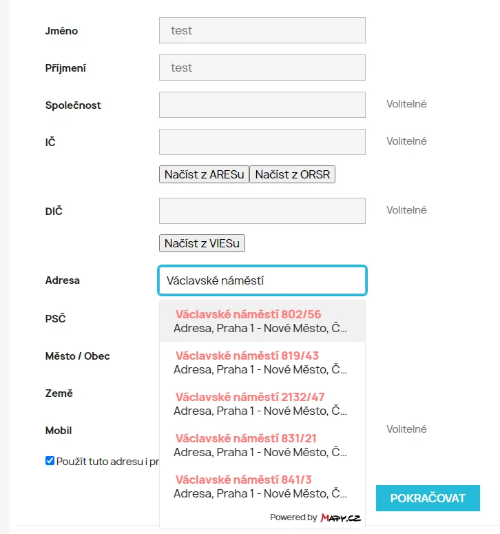 Našeptávač od Mapy.cz efektivně řeší problém se špatně zadanými adresami. Po zadání ulice je automaticky doplněno město, PSČ a stát. Díky tomu se můžete vyhnout situacím, kdy zákazník zapomene uvést číslo popisné nebo jiné důležité údaje.