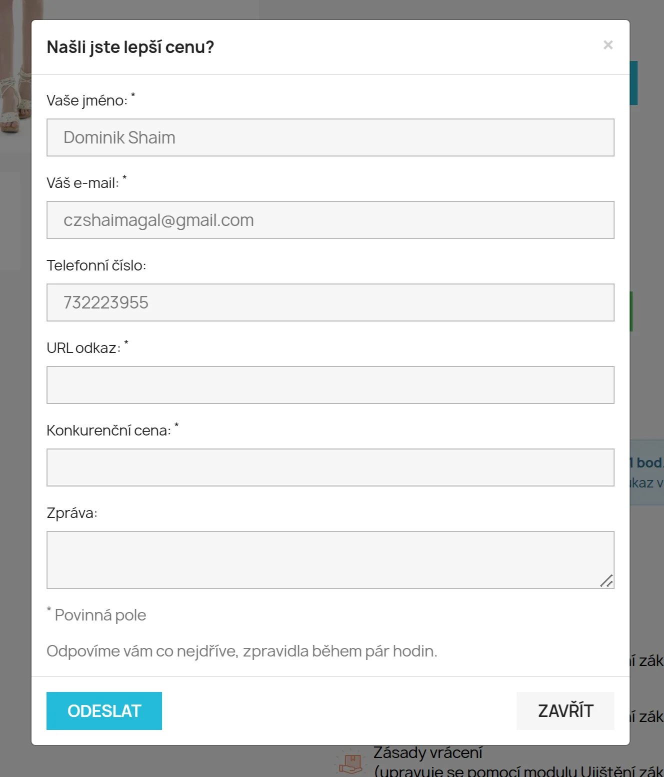Vaši zákazníci budou mít možnost využít jednoduchý formulář, kde mohou zadat informace o lepší ceně. Pokud je zákazník přihlášený, systém automaticky předvyplní jeho jméno, e-mail a telefonní číslo, což usnadní a urychlí proces odeslání dotazu.