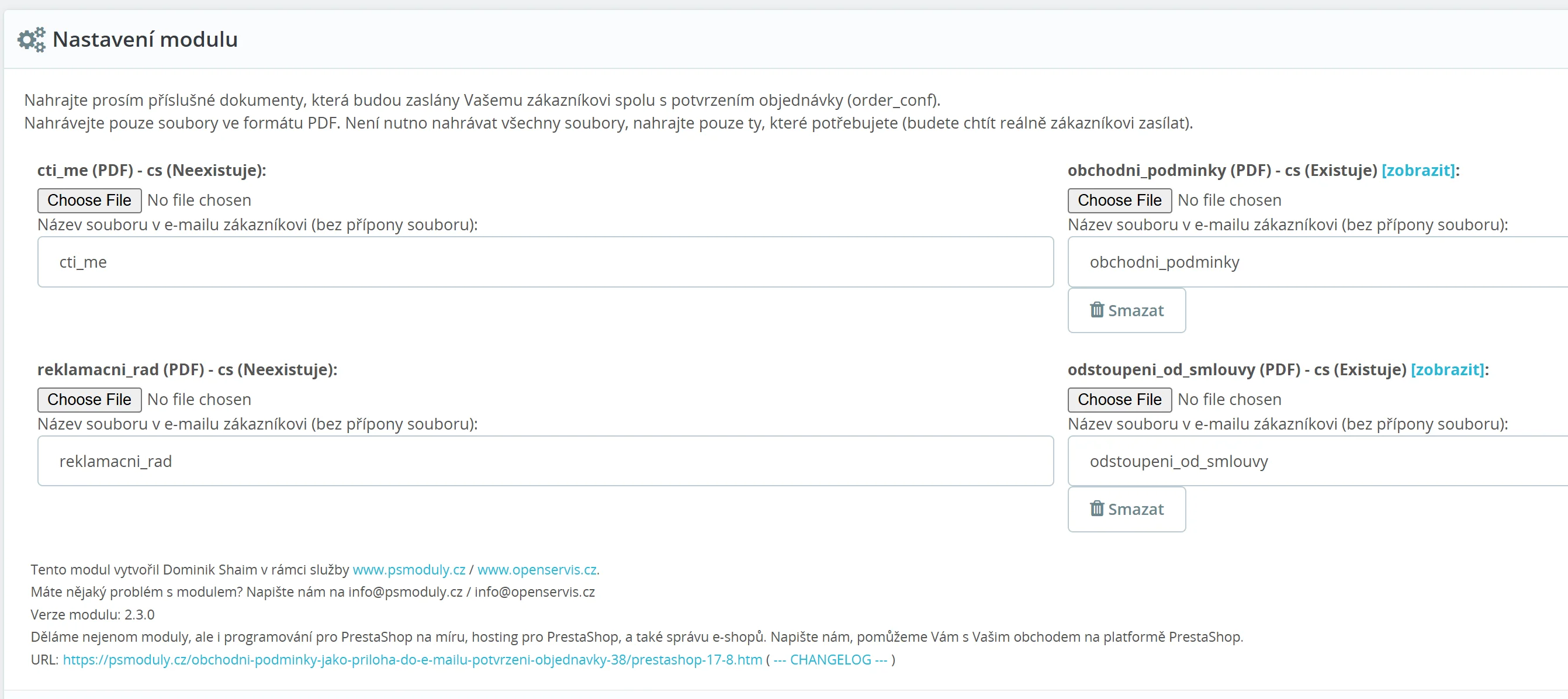 Povinností každého e-shopu je přiložit obchodní podmínky do e-mailu "Potvrzení o objednávce" (order_conf). V modulu můžete nastavit jaké přílohy se přidají do e-mailu. Kromě obchodních podmínek můžete využít jako přílohy i Vaše vlastní PDF soubory.