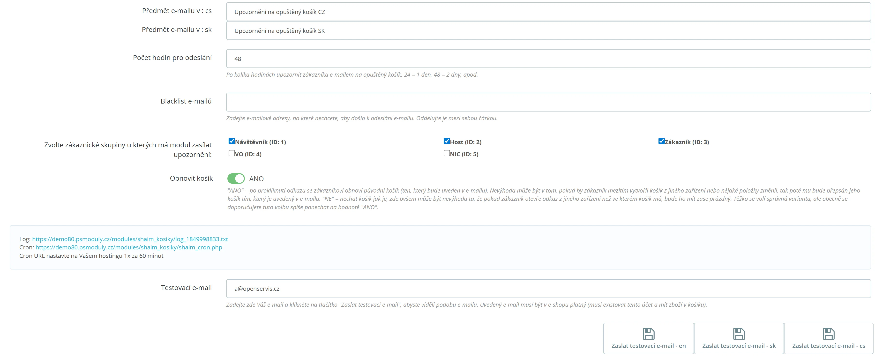 Po instalaci modulu se systém zaměří pouze na košíky, které byly vytvořeny za posledních 14 dní před datem instalace. Tímto způsobem se vyhnete odesílání upozornění na staré košíky, které by mohly zákazníky odradit.