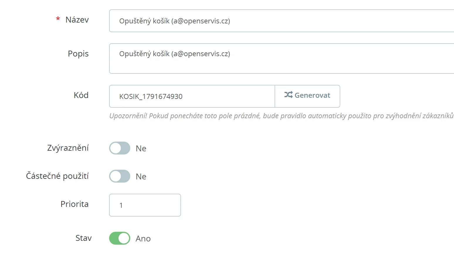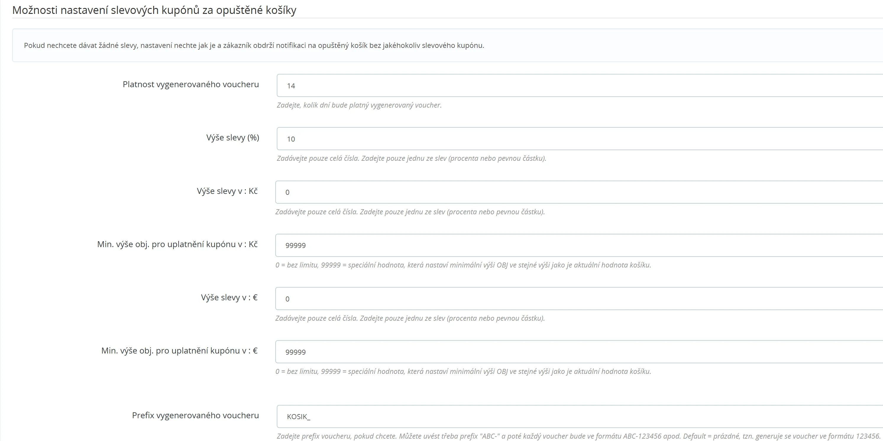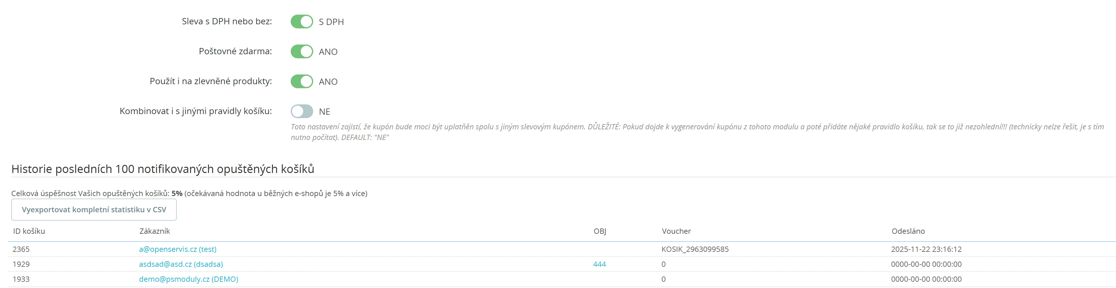 Modul umožňuje i nastavit slevový voucher jako motivaci zákazníka k dokončení nákupu a to jak v % výši, tak v pevné částce. Případně je možno nastavit i dopravu zdarma.