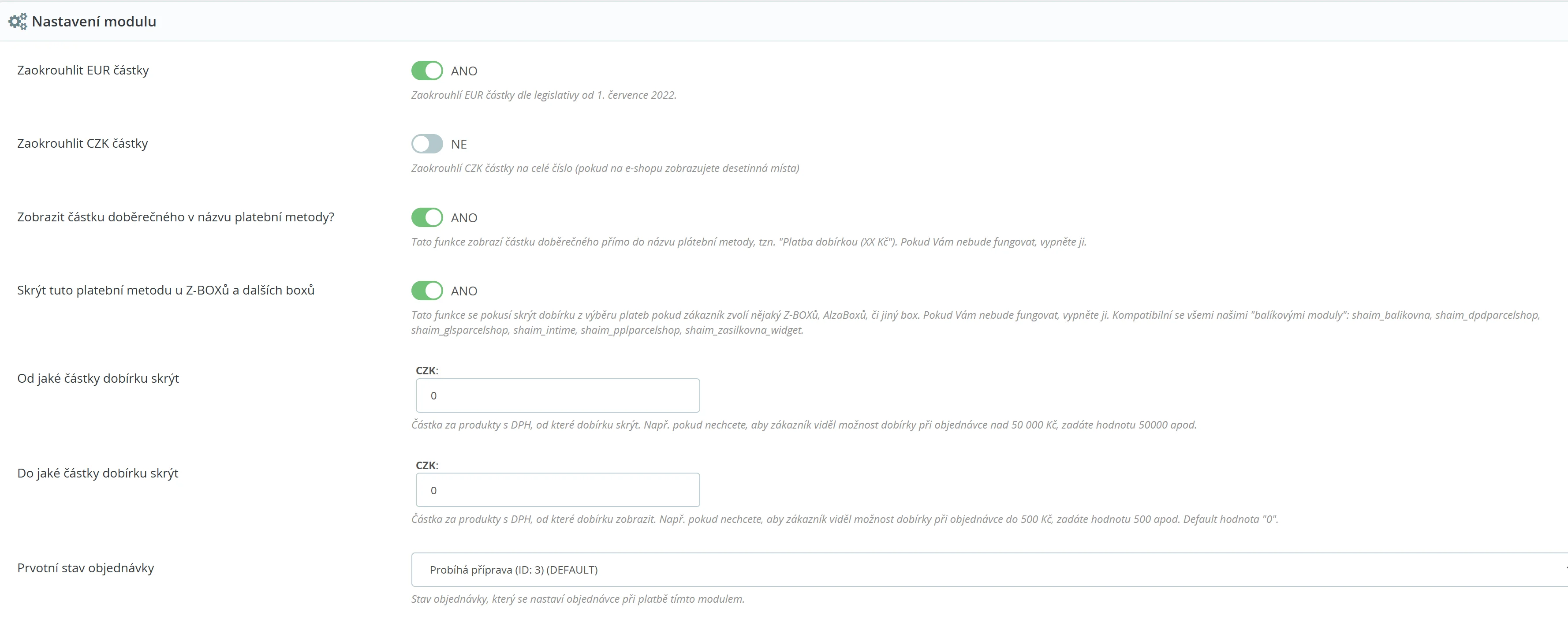 V základním PrestaShopu není k dispozici doplatek za dobírku. Hlavním benefitem tohoto modulu je právě možnost nastavení doplatku (doběrečné). Pro každého dopravce můžete nastavit rozdílnou výši doplatku za dobírku