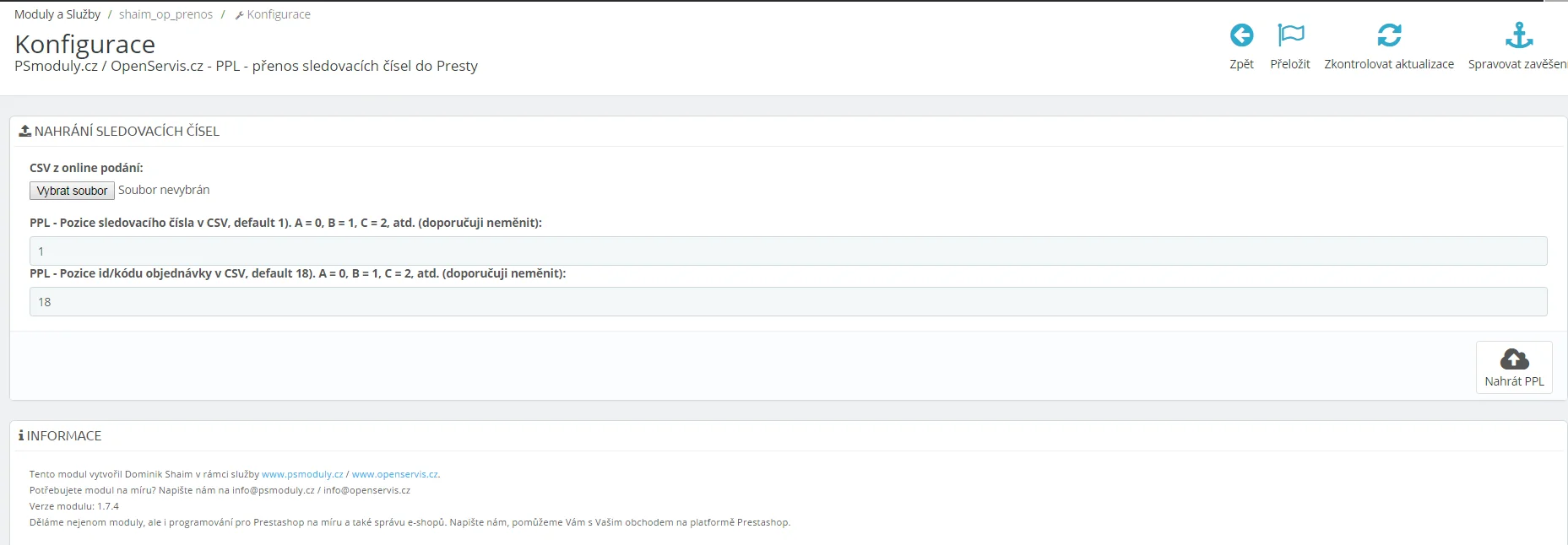 Modul PPL - Online podání umožňuje snadný a efektivní přenos sledovacích čísel od dopravce PPL přímo do vašeho PrestaShopu. Díky tomuto modulu se již nebudete muset zabývat ručním přepisováním sledovacích čísel. Stačí jednoduše nahrát CSV soubor z Online podání a všechny sledovací čísla se automaticky spárují s objednávkami. Kromě toho se také nastaví příslušnému objednávkám stav odesláno, přičemž je možné v nastavení modulu zvolit i jiný stav dle vašich preferencí.
