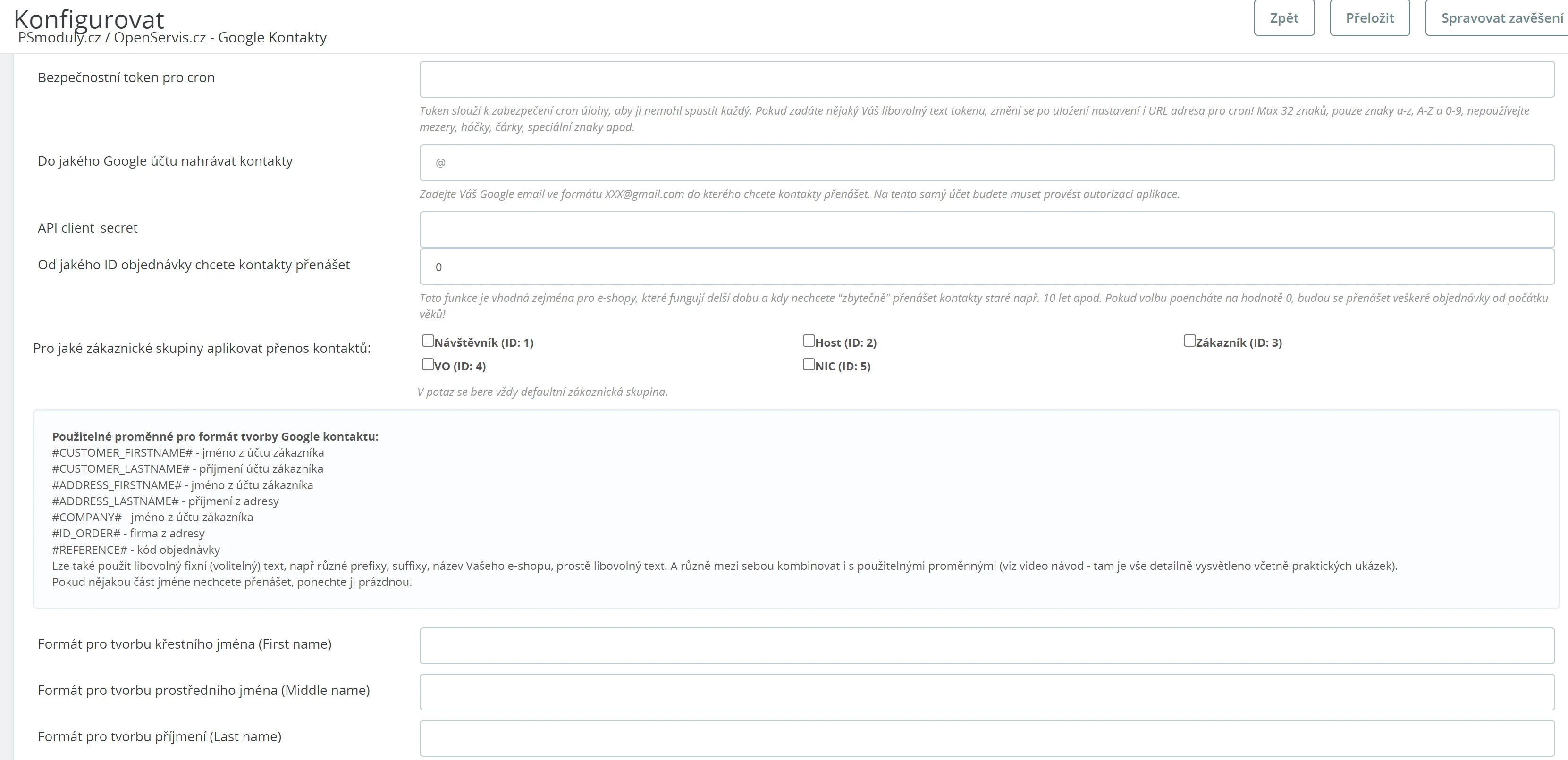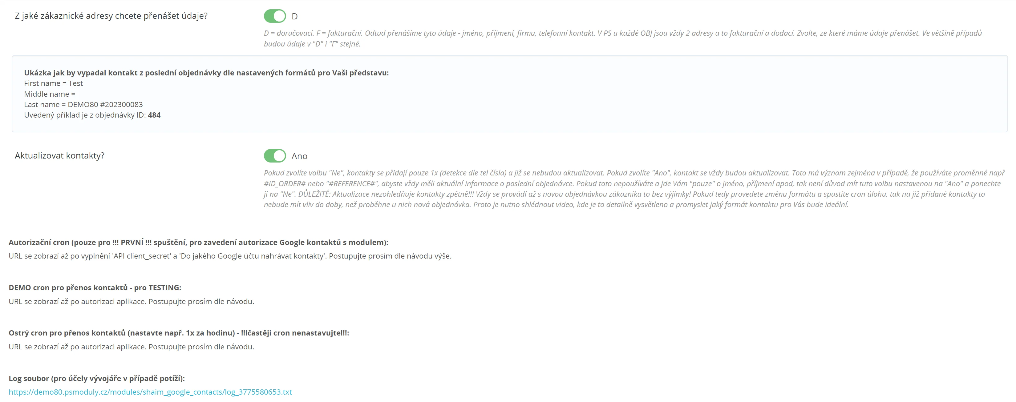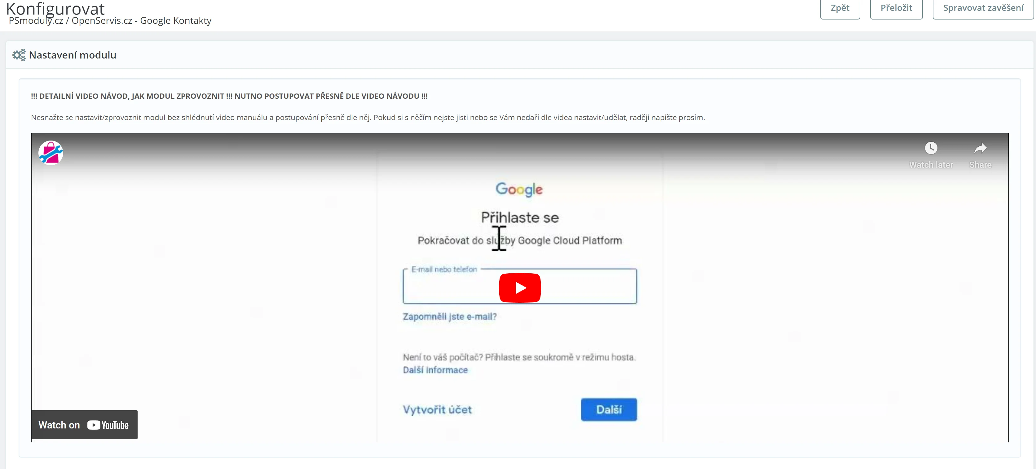 Modul využívá Google Cloud Console ("People API"). Součástí ceny modulu je také implementace aplikace a poradenství. Je nutné provést autorizaci aplikace a veškeré potřebné nastavení přímo v API. Doporučujeme vám shlédnout detailní video návod, který vám pomůže s nastavením modulu. Prosím, nevytvářejte nastavení bez shlédnutí videa!
