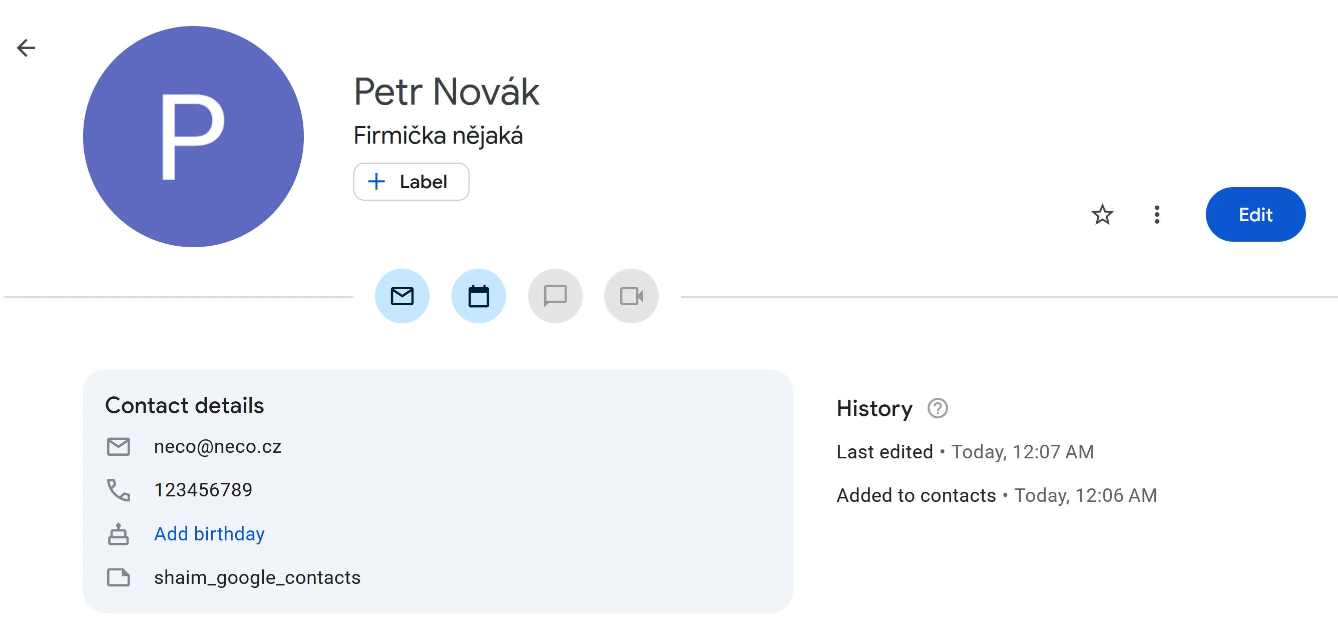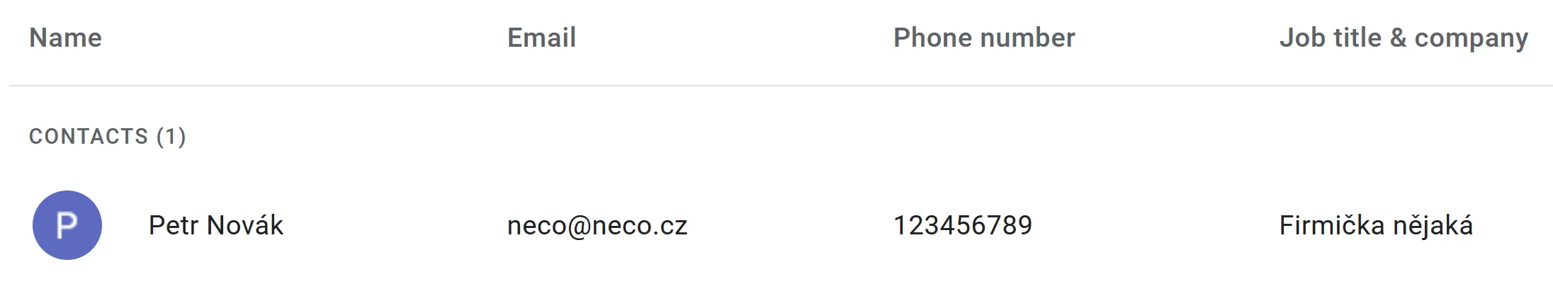 Pokud na vašem e-shopu ABC.cz nakoupí pan Petr Novák a jeho objednávka má kód 12345, výsledný Google kontakt se bude jmenovat například: ABC.cz - Novák - 12345. Toto pojmenování je konfigurovatelné, což znamená, že si můžete dle potřeby upravit pořadí nebo vynechat některé položky.