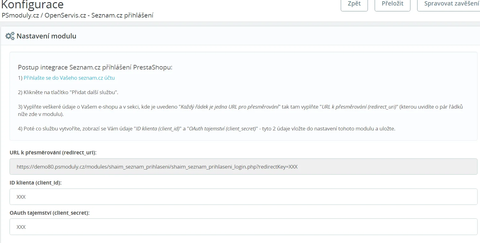 Modul je doporučován přímo Seznamem. Podrobnosti najdete v článku na Seznam Blogu s názvem "Modul Přihlášení přes Seznam je nově dostupný i na platformě PrestaShop".