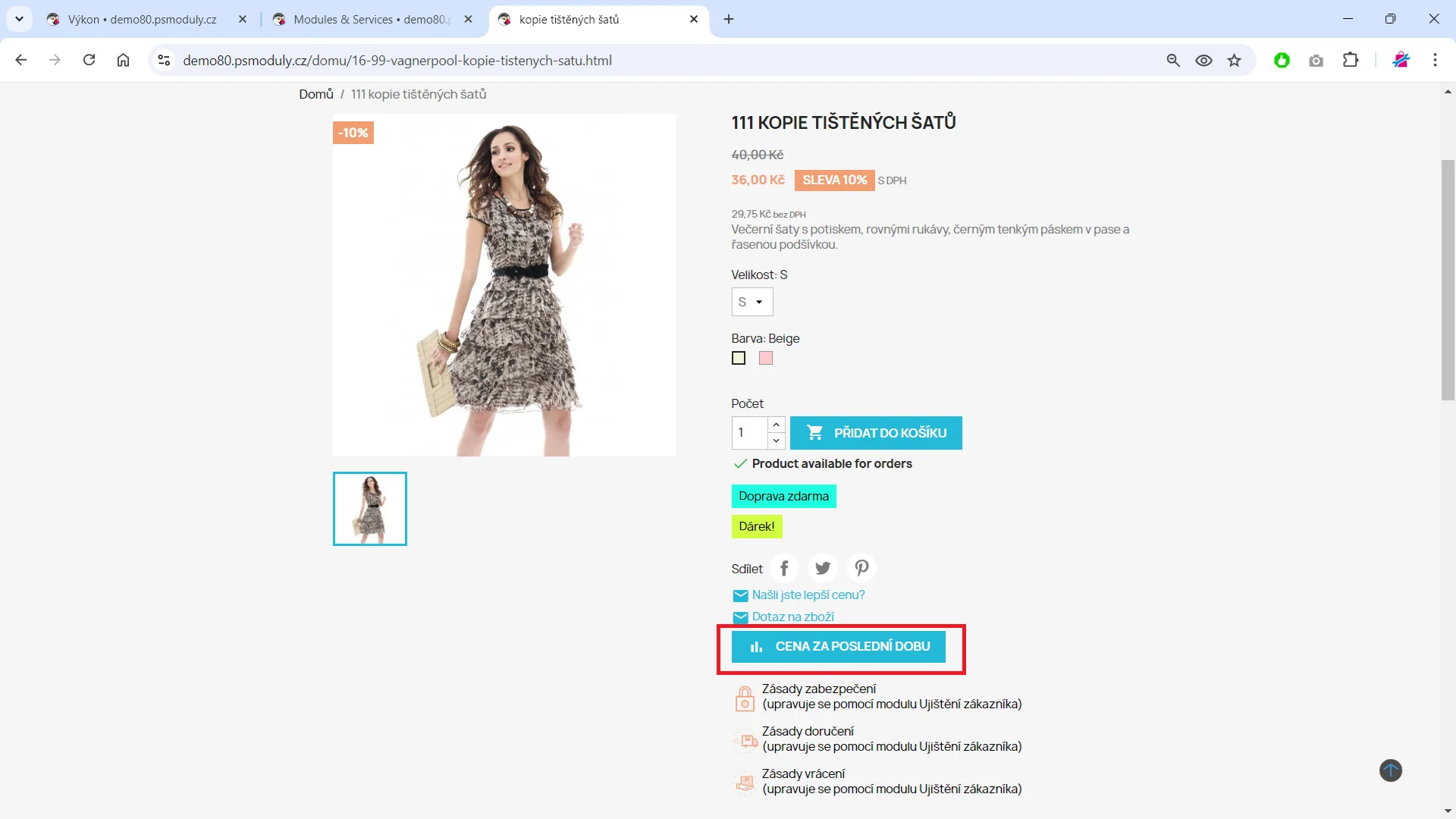 Máte možnost si zvolit zobrazení historie cen buď přímo na stránce, nebo pomocí popup okna. Textaci modulu je také možné libovolně upravit v překladech modulu, což zaručuje vysokou míru přizpůsobení Vašim potřebám.