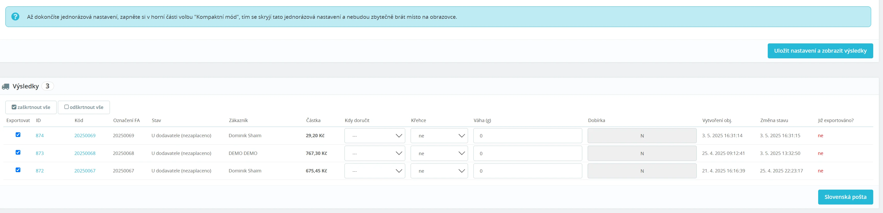 Struktura XML pro Slovenskou poštu je plně v souladu se specifikacemi a je připravena pro online podání (ePodací hárok). Po předchozí domluvě je možné tuto strukturu upravit či doplnit dle vašich specifických požadavků. Modul byl vyvíjen ve spolupráci se Slovenskou poštou, která jej schválila jako plně funkční, a to jak pro Balík na poštu, tak pro ePodací hárok.