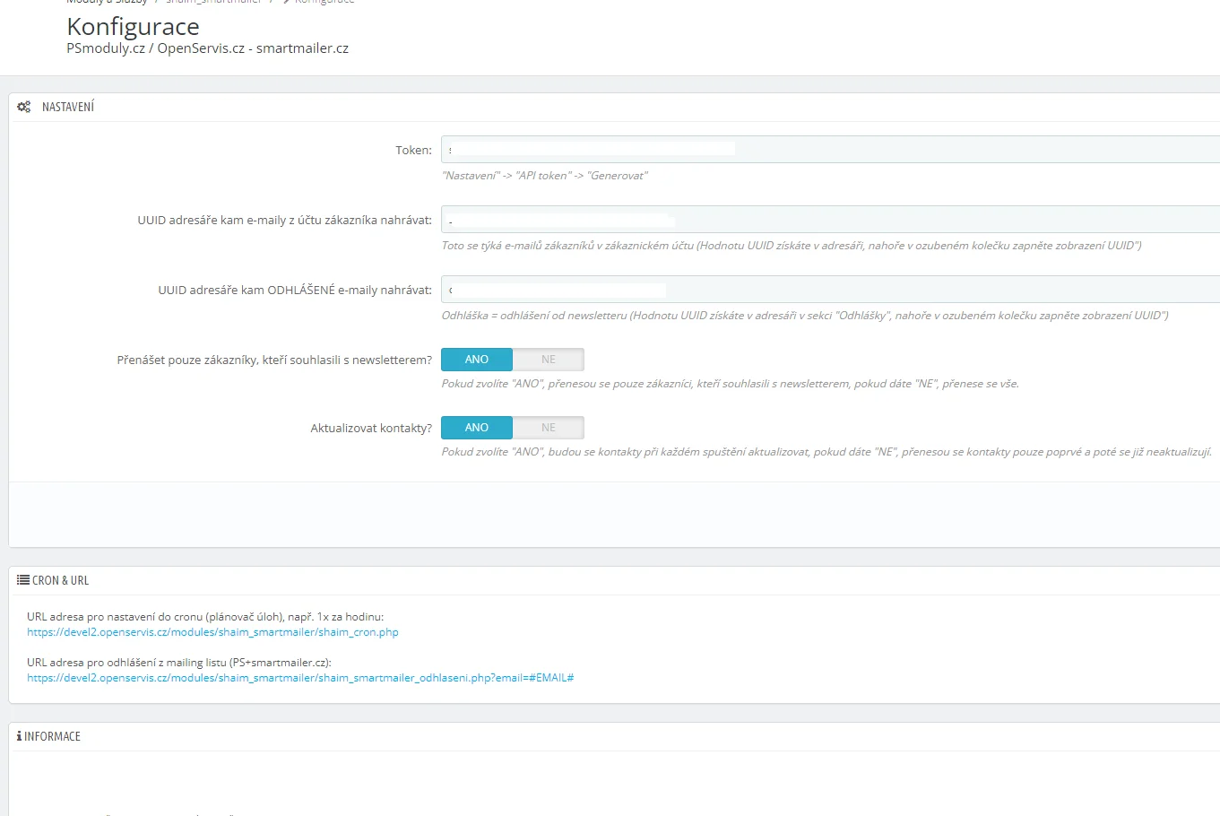 Pro zprovoznění modulu stačí vyplnit API token a nastavit cron pro pravidelné nahrávání nových kontaktů. Token naleznete v administraci smartmailer.cz po přihlášení, v záložce "Nastavení" -> "API token" -> "Generovat". Tento token poté jednoduše vložíte do modulu.