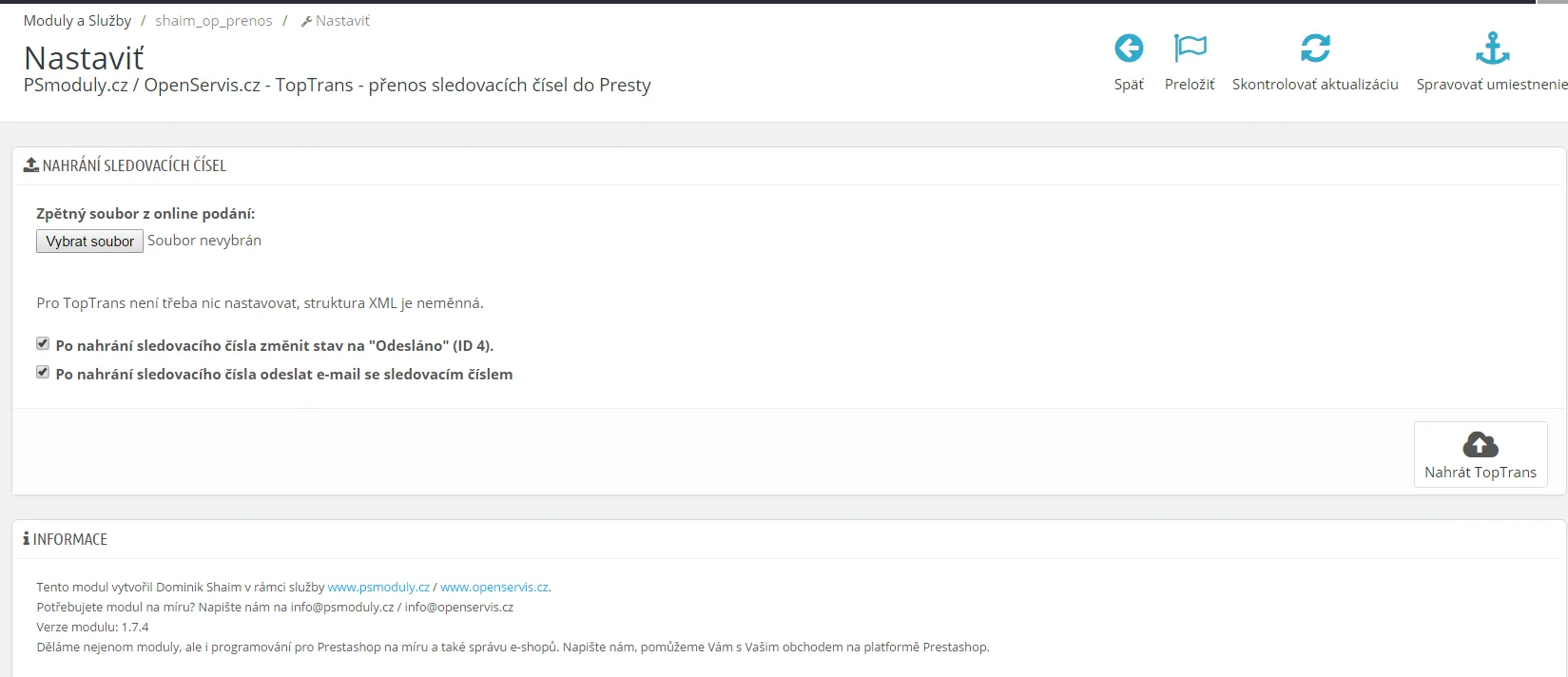 Modul Toptrans - Online podání slouží k efektivnímu hromadnému nahrávání sledovacích čísel z Online podání Toptrans přímo do vašeho PrestaShopu. S tímto modulem již nebudete muset ručně přepisovat sledovací čísla; vše se provede automaticky.