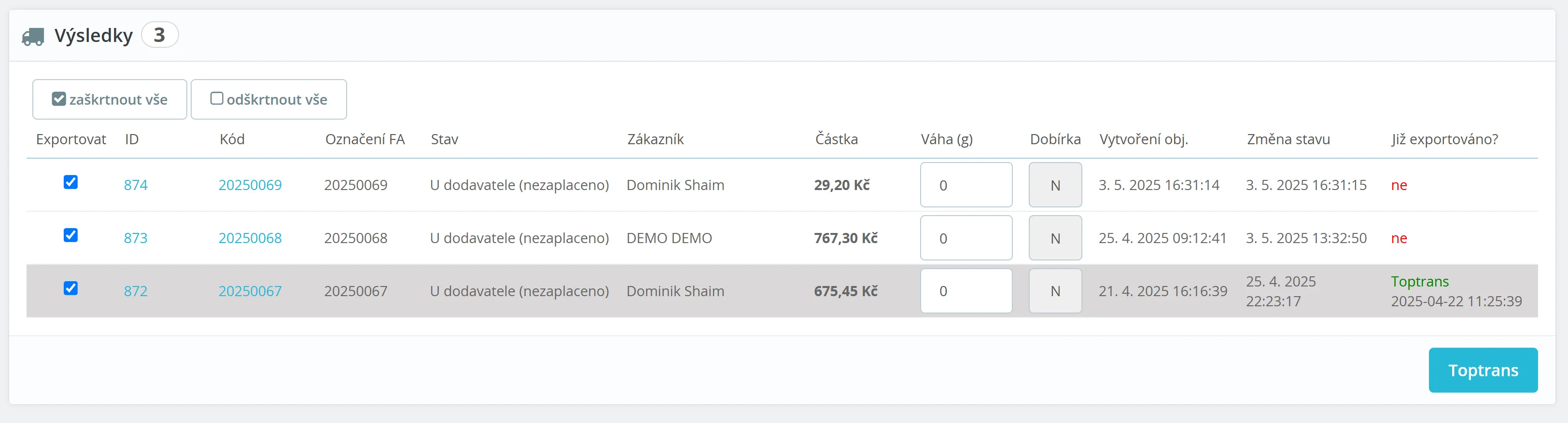 Zajistěte přenos sledovacích čísel z Vašeho PrestaShopu do administračního rozhraní dopravce Toptrans. Pomocí CSV souboru přenesete data o objednávkách přímo do online podání dopravce, abyste nemuseli opisovat údaje ručně (jméno, adresa, ulice, psč, ...). Tento modul je součástí výhodného balíčku "Online podání" - doporučujeme.