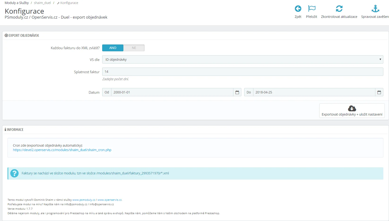 Modul zajišťuje exportování XML feedů pro účetní systém DUEL a to jak objednávky, tak faktury. Díky tomu budete moci na pravidelné bázi přenášet data do Vašeho účetního systému a zde s nimi dále pracovat.