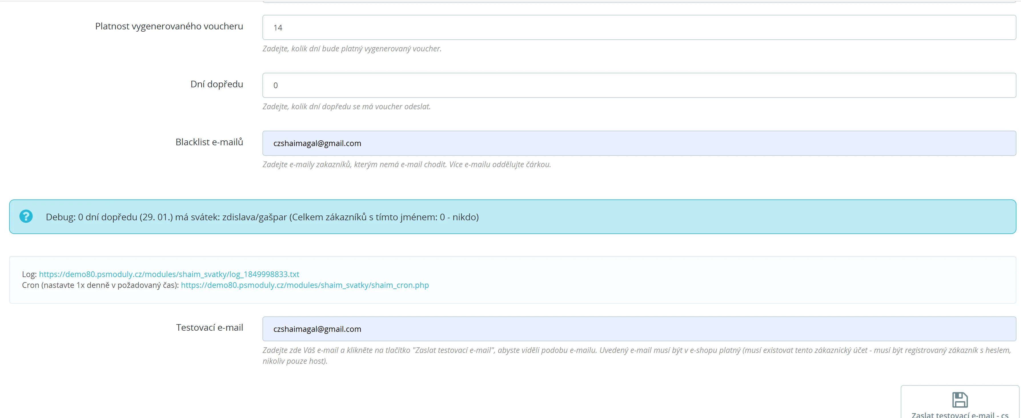 Modul automaticky zasílá slevové vouchery všem zákazníkům, kteří mají svátek. Jeho konfigurovatelnost zahrnuje: