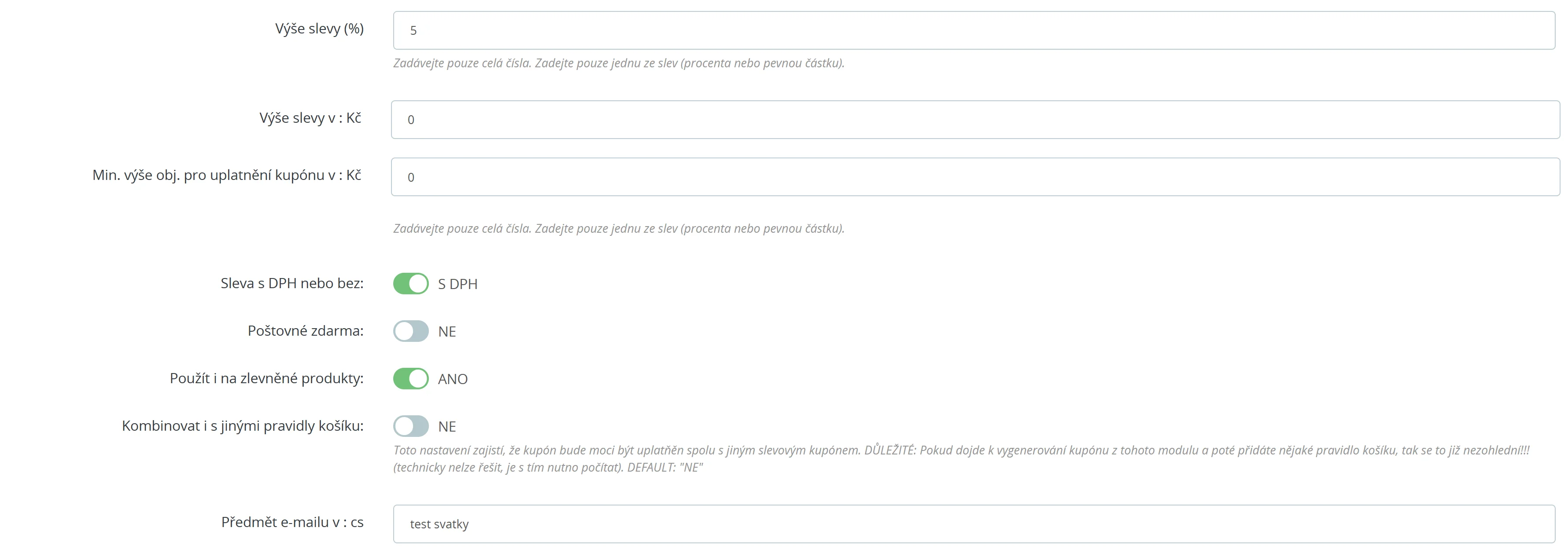 Využijte svátky ke zvýšení Vašich prodejů. Pomocí modulu můžete zákazníkům zaslat ke svátku slevový kupón a třeba u Vás nakoupí. Kupón je možno poslat i s předstihem a nastavení je konfigurovatelné.