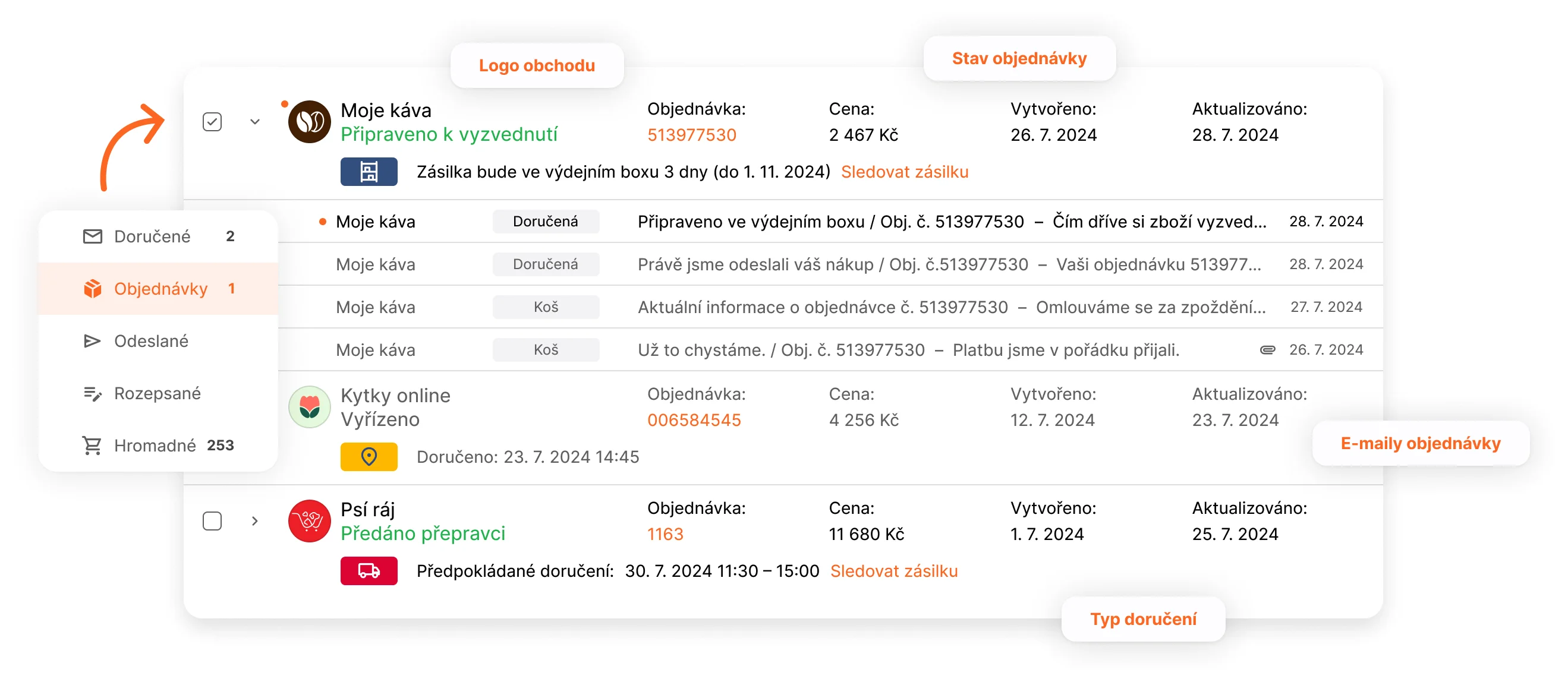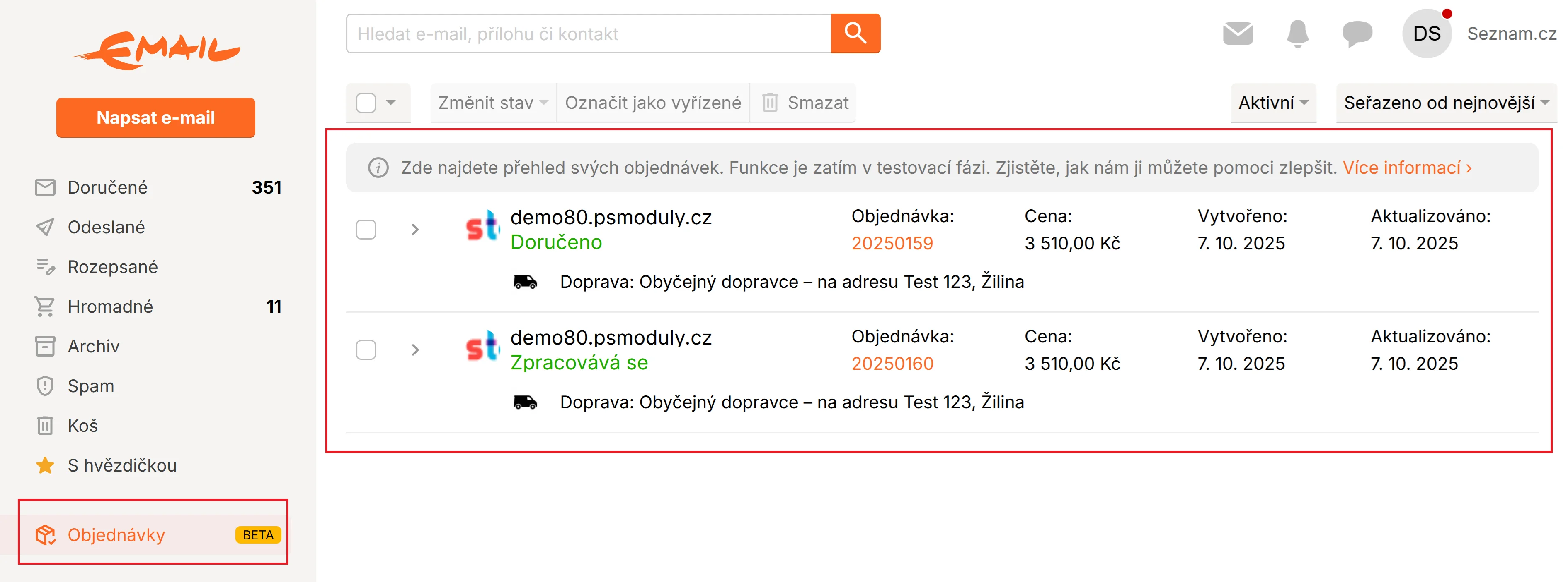 Seznam přináší novinku, která umožňuje obchodníkům zobrazit informace o objednávkách přímo v e-mailových schránkách zákazníků. Viz obrázek.