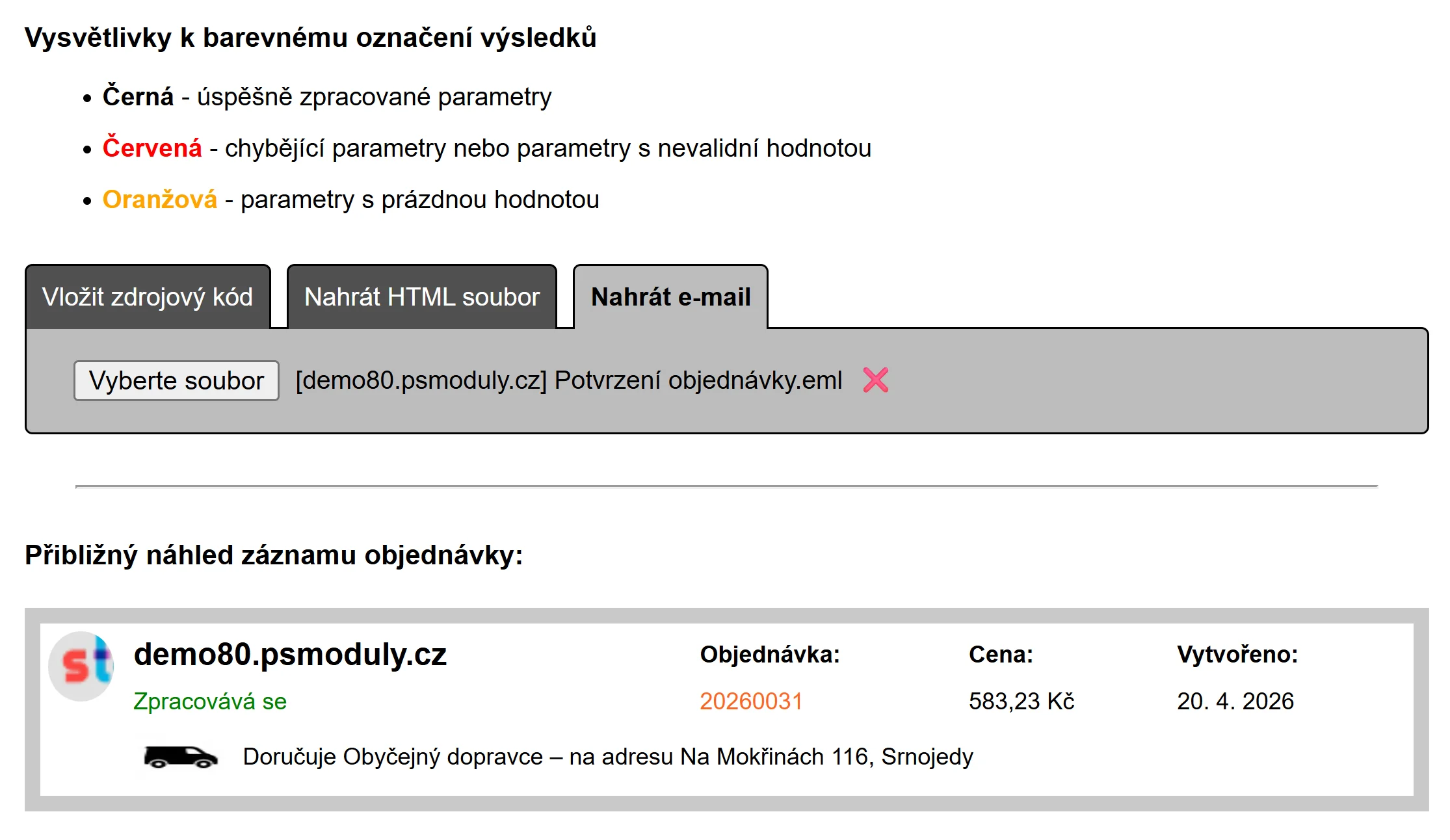 Ověření, že se strukturovaná JSON LD data vyskytují v emailu se dá způsobem, že si necháte z PrestaShopu udělat například test objednávku, stáhnete si zdroj emailu (EML) a poté může toto EML nahrát do nástroje "Validace schemat pro zpracování objednávek v Emailu" přímo od Seznamu.